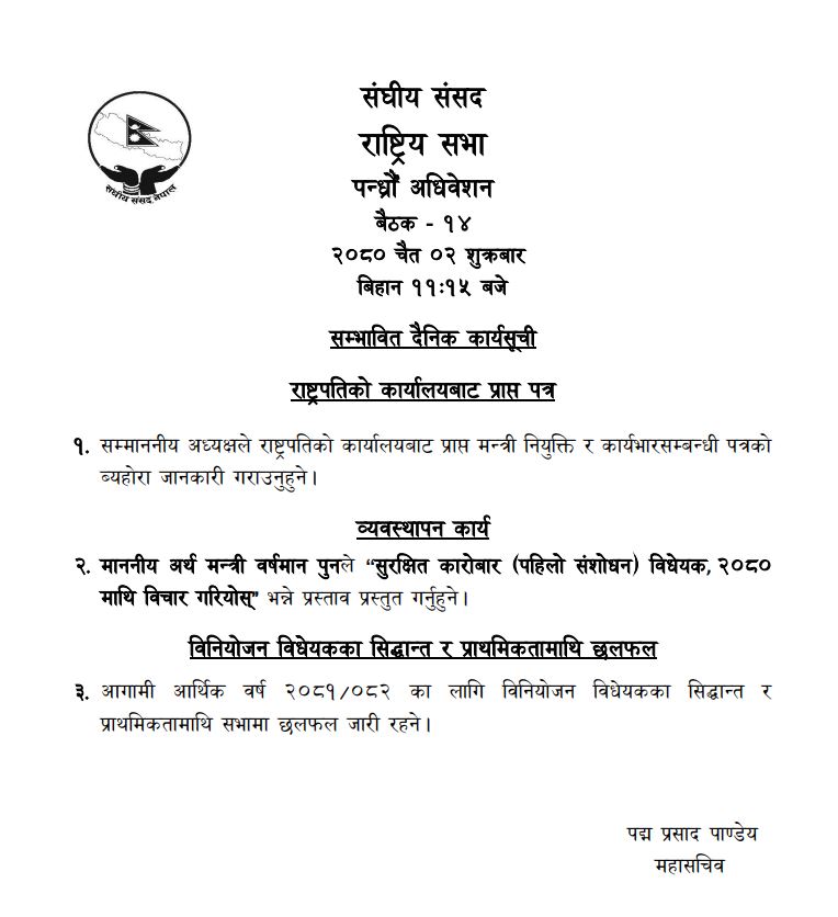 साथै, आ.ब. २०८१-८२ को लागि बिनियोजन बिधेयकका सिद्दान्त र प्राथमिकता सबन्धमा (कर प्रस्तावबाहेक) माथी छलफल जारी रहने महासचिव पदमप्रसाद पाण्डेयले जारी गरेको सम्भावित कार्यसुचीमा उल्लेख गरिएको छ ।