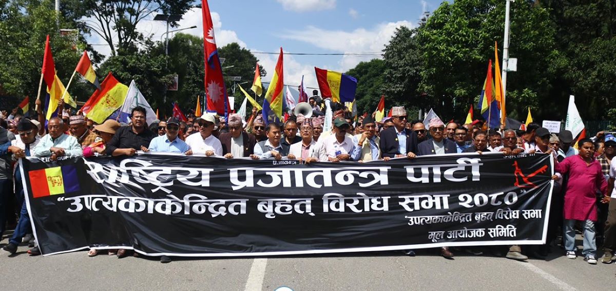 काठमाडाैं । सरकारसमक्ष राष्ट्रियता, विकास, सुशासन, सेवाप्रवाह र जनजीविकासँग सम्बन्धित विभिन्न ४० बॅुदे मागपत्र पेश गरेर आन्दोलनमा होमिएको राप्रपाले चैत २७ गते काठमाण्डौं केन्द्रीत जनप्रदर्शन गर्दै छ।