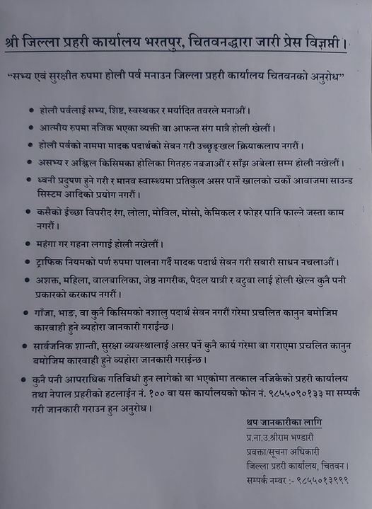चितवन । जिल्ला प्रहरी कार्यालय चितवनले यस वर्षको होली पर्व सभ्य एवं सुरक्षित रूपमा मनाउन अनुरोध गरेको छ। आज एक सूचना जारी गर्दै होली पर्वलाई सभ्य, शिष्ट, स्वस्थकर र मर्यादित तवरले मनाउन अनुरोध गरेको हो।