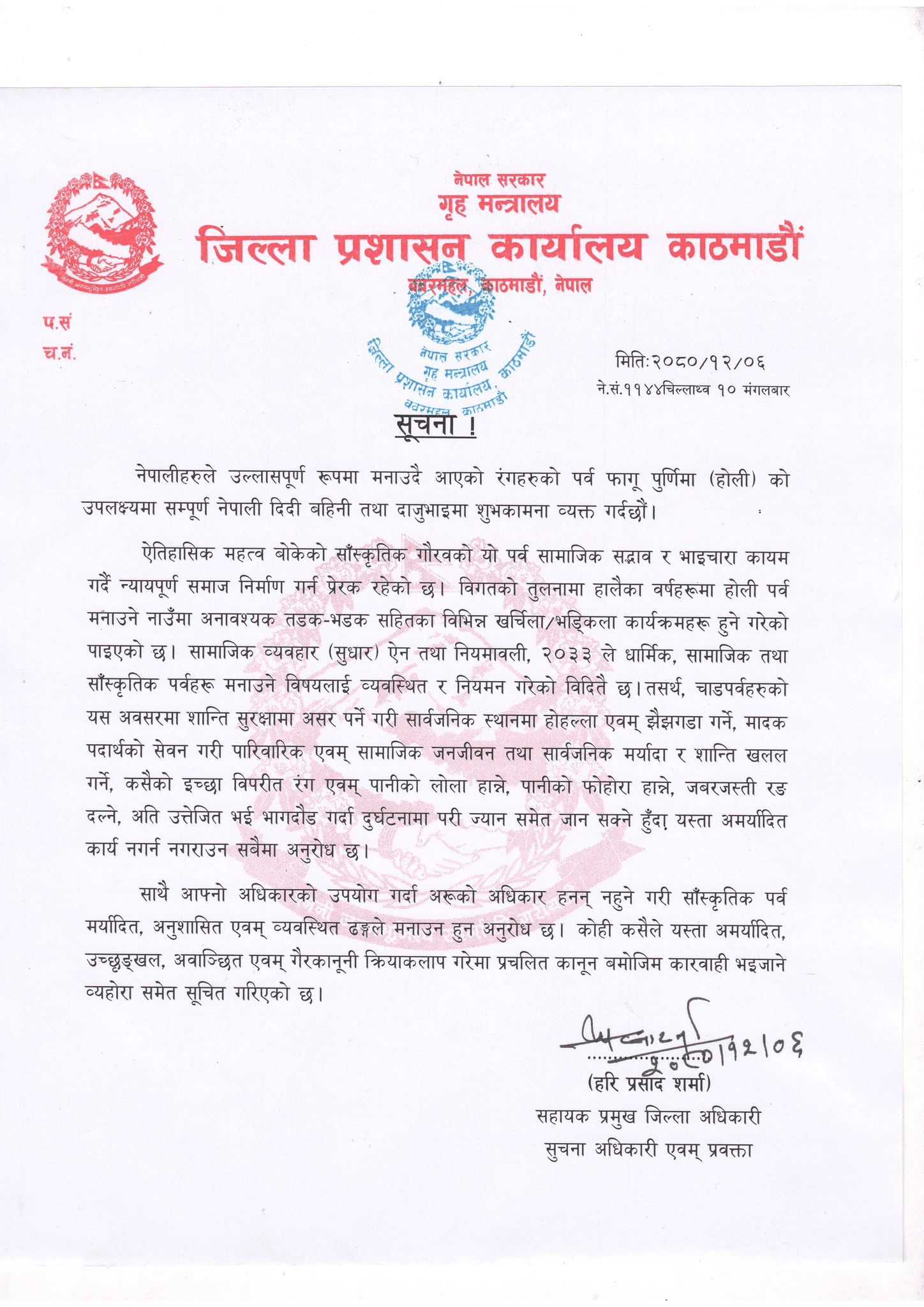 सहायक प्रमुख जिल्ला अधिकारी हरि प्रसाद शर्माले जारी गरेको सूचनामा भनिएको छ, ‘चाडपर्वहरूको यस अवसरमा शान्ति सुरक्षामा असर पर्ने गरी सार्वजनिक स्थानमा होहल्ला एवं झैझगडा गर्ने, मादक पदार्थको सेवन गरी पारिवारिक एवं सामाजिक जनजीवन तथा सार्वजनिक मर्यादा र शान्ति खलल गर्ने, कसैको इच्छा विपरीत रङ्ग एवं पानीको लोला हान्ने, पानीको फोहोरा हान्ने, जबरजस्ती रङ दल्ने, अति उत्तेजित भई भागदौड गर्दा दुर्घटनामा परी ज्यान समेत जान सक्ने हुँदा यस्ता अमर्यादित कार्य नगर्न नगराउन सबैमा अनुरोध छ ।’