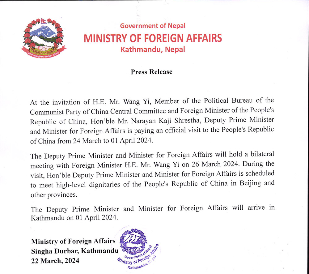 काठमाडौँ । उपप्रधानमन्त्री एवं परराष्ट्रमन्त्री नारायणकाजी श्रेष्ठ चीनका विदेशमन्त्री वाङ यीको निमन्त्रणामा चीनको औपचारिक भ्रमणमा जाने भएका छन् ।