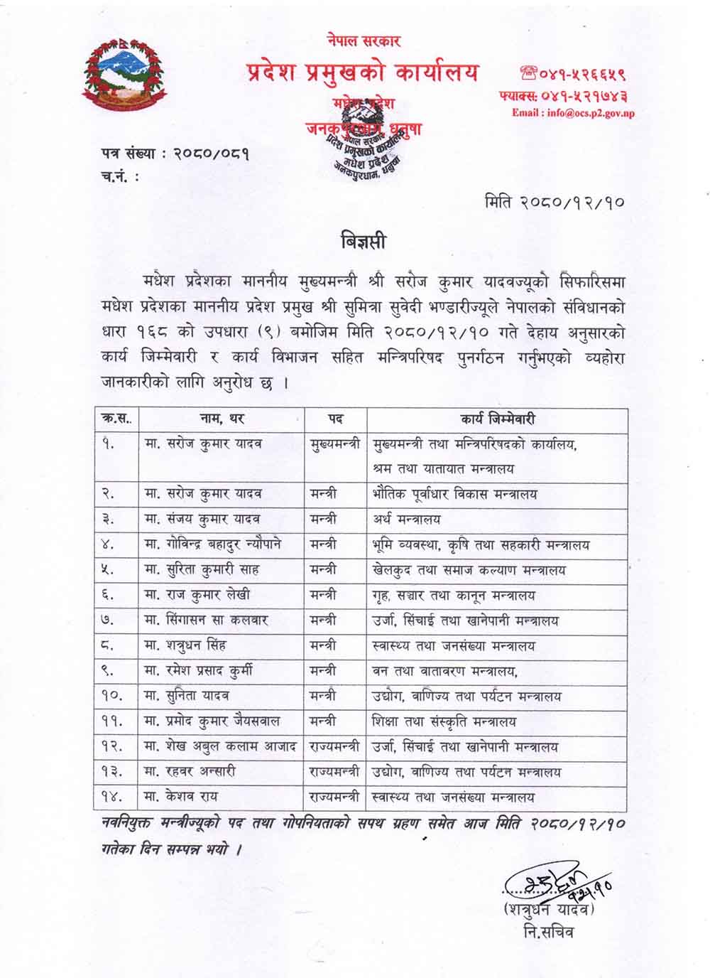 राजकुमार लेखीले गृह, सञ्चार तथा कानून, शत्रुधन सिंहले स्वास्थ्य तथा जनसंख्या मन्त्री र एमालेमा प्रवेश गरेका प्रमोद जयसवालले शिक्षा तथा संस्कृति मन्त्रीको रुपमा शपथ लिएका हुन्।