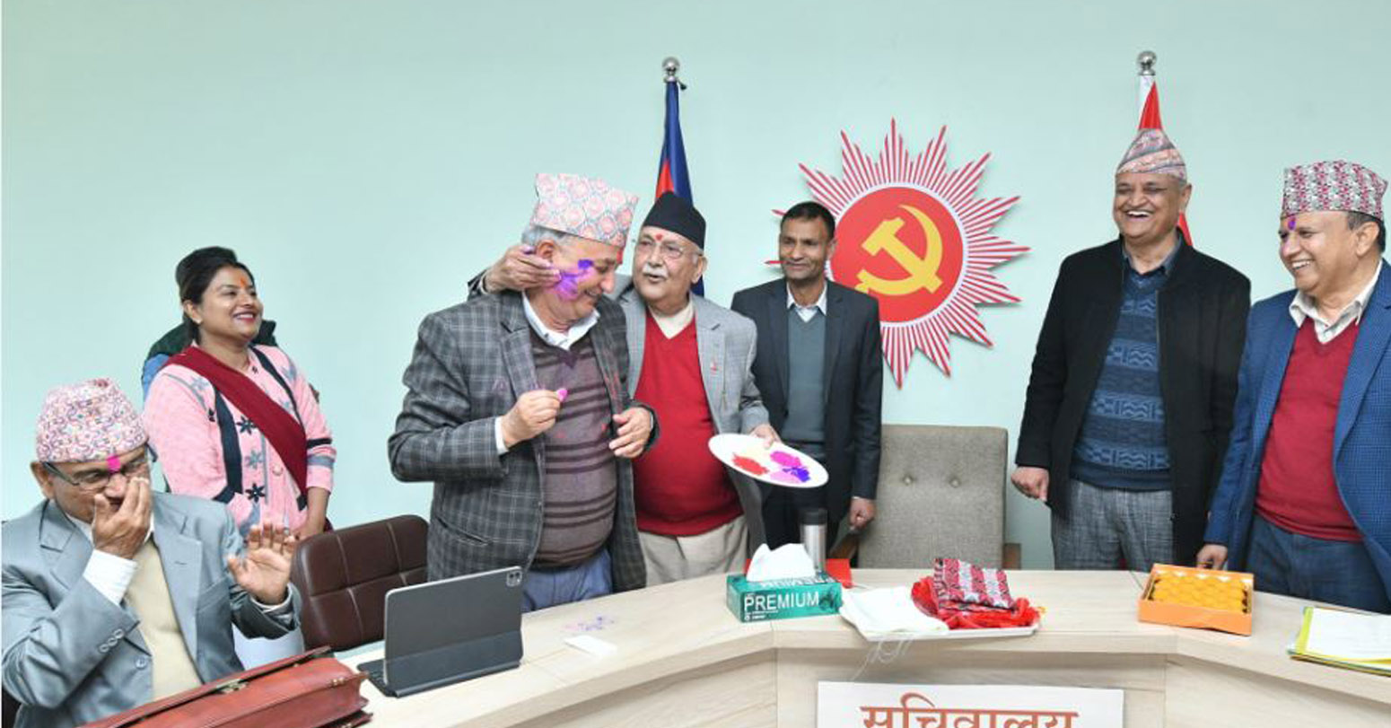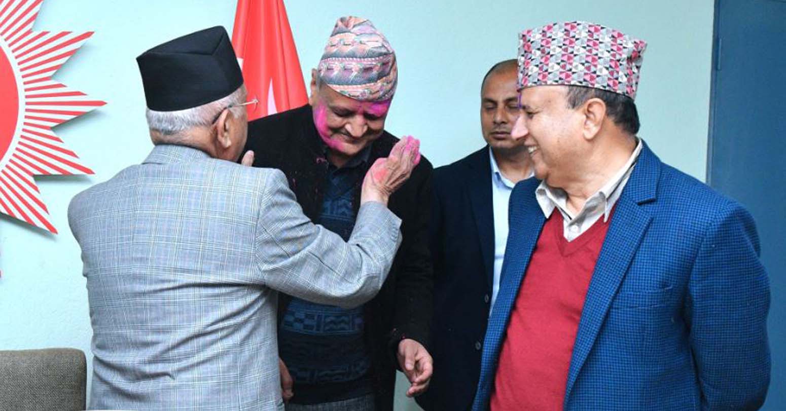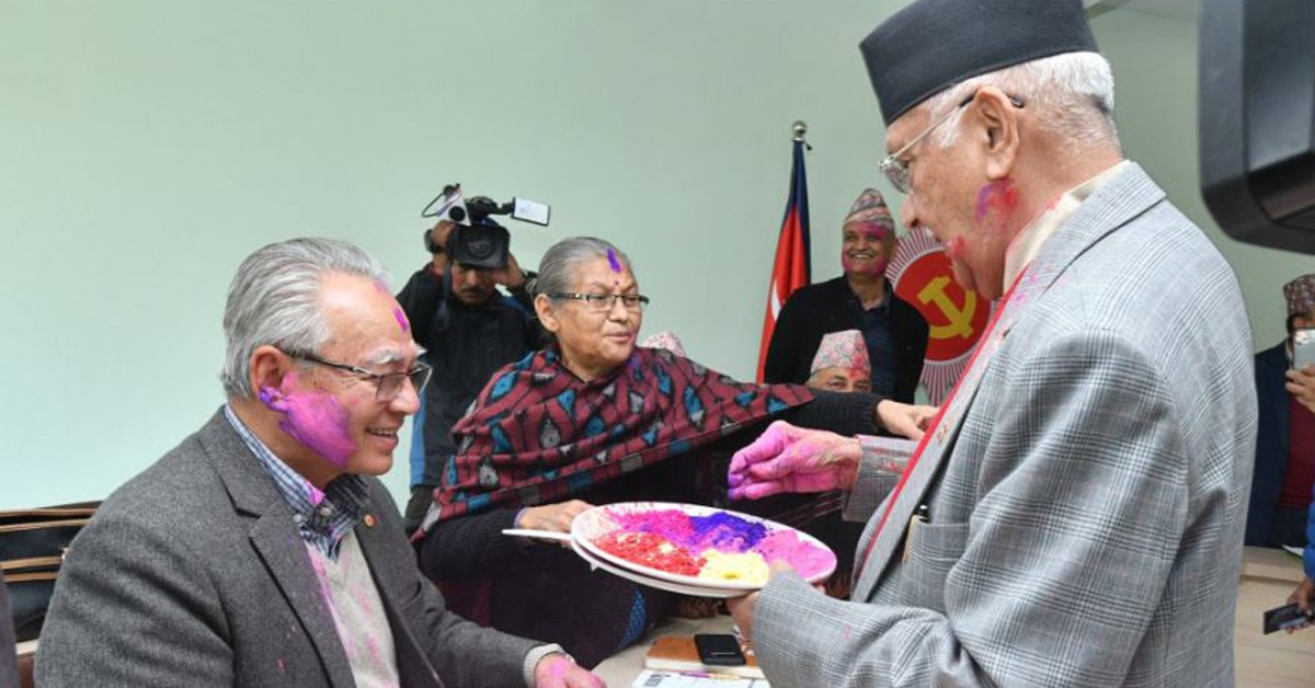पार्टी मुख्यालय च्यासलमा सचिवालय बैठक बस्नुअघि नेताहरूले एकअर्कामा रङ दलेर होली मनाएका थिए ।