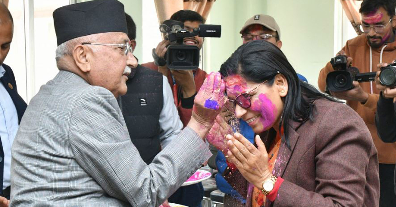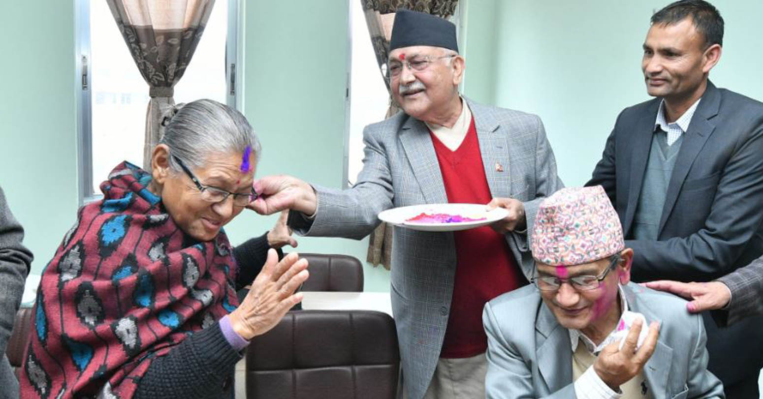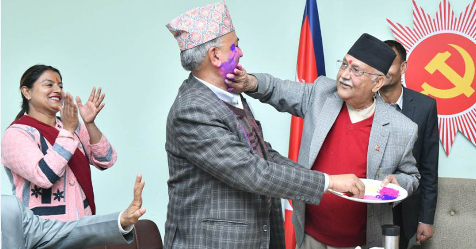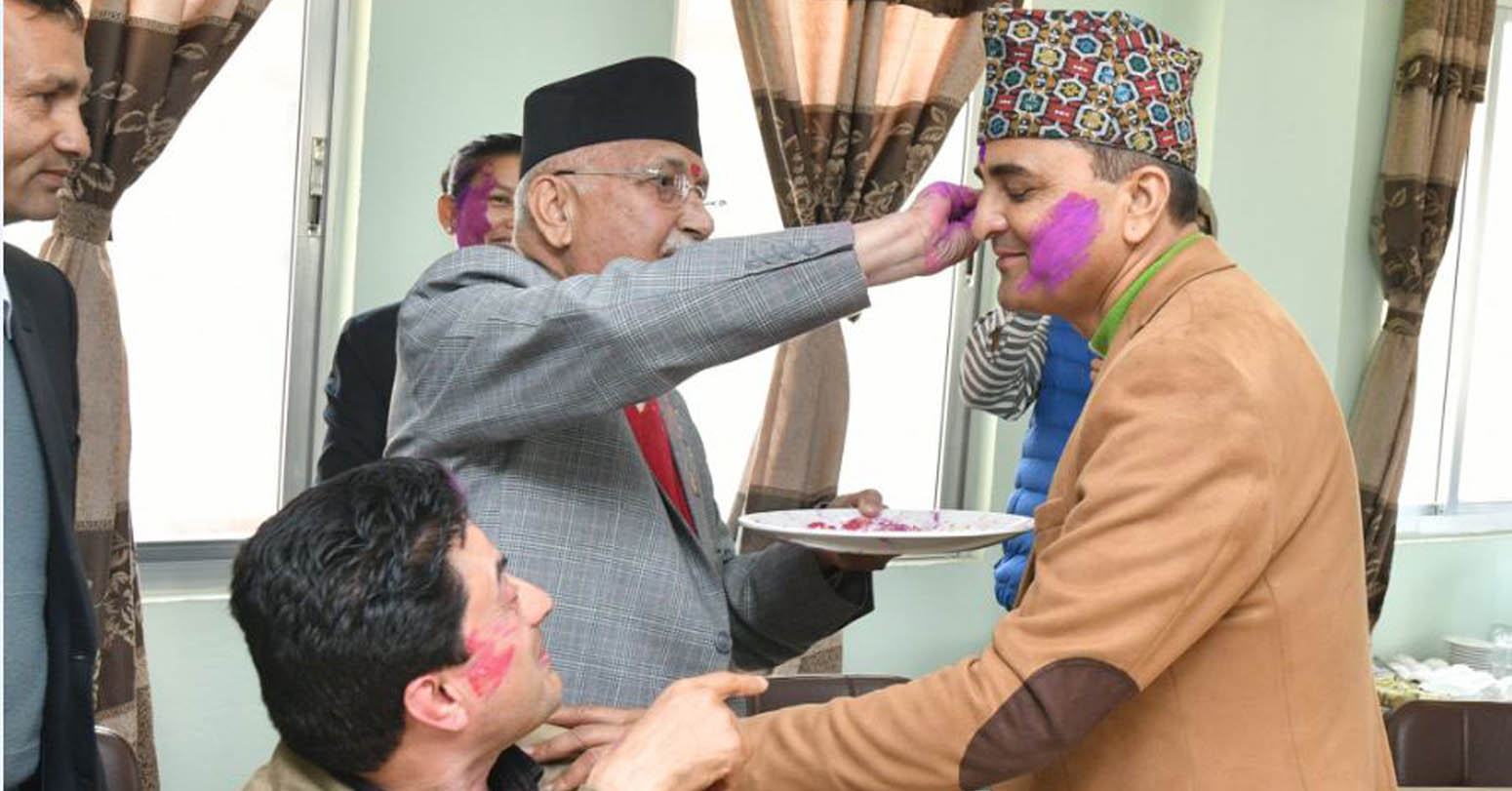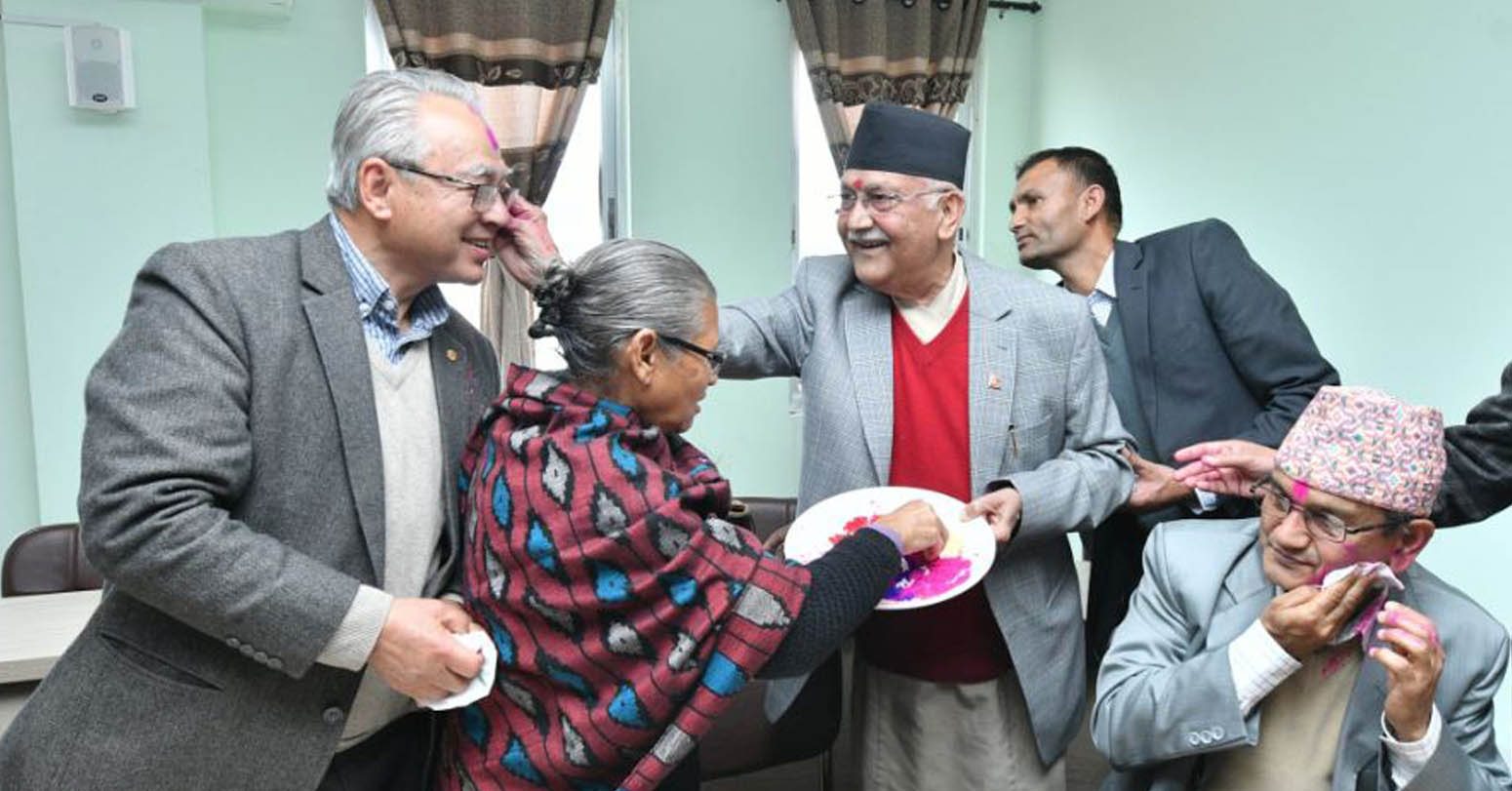 बैठकअघि नेकपा एमाले अध्यक्ष केपी शर्मा ओली, वरिष्ठ उपाध्यक्ष, ईश्वर पोखरेल, उपाध्यक्ष, अष्टलक्ष्मी शाक्य र सुरेन्द्रप्रसाद पाण्डे, महासचिव शंकर पोखरेल लगायतका पार्टी पदाधिकारीहरुले एक अर्कालाई रङ दलेर होली मनाएका हुन् ।