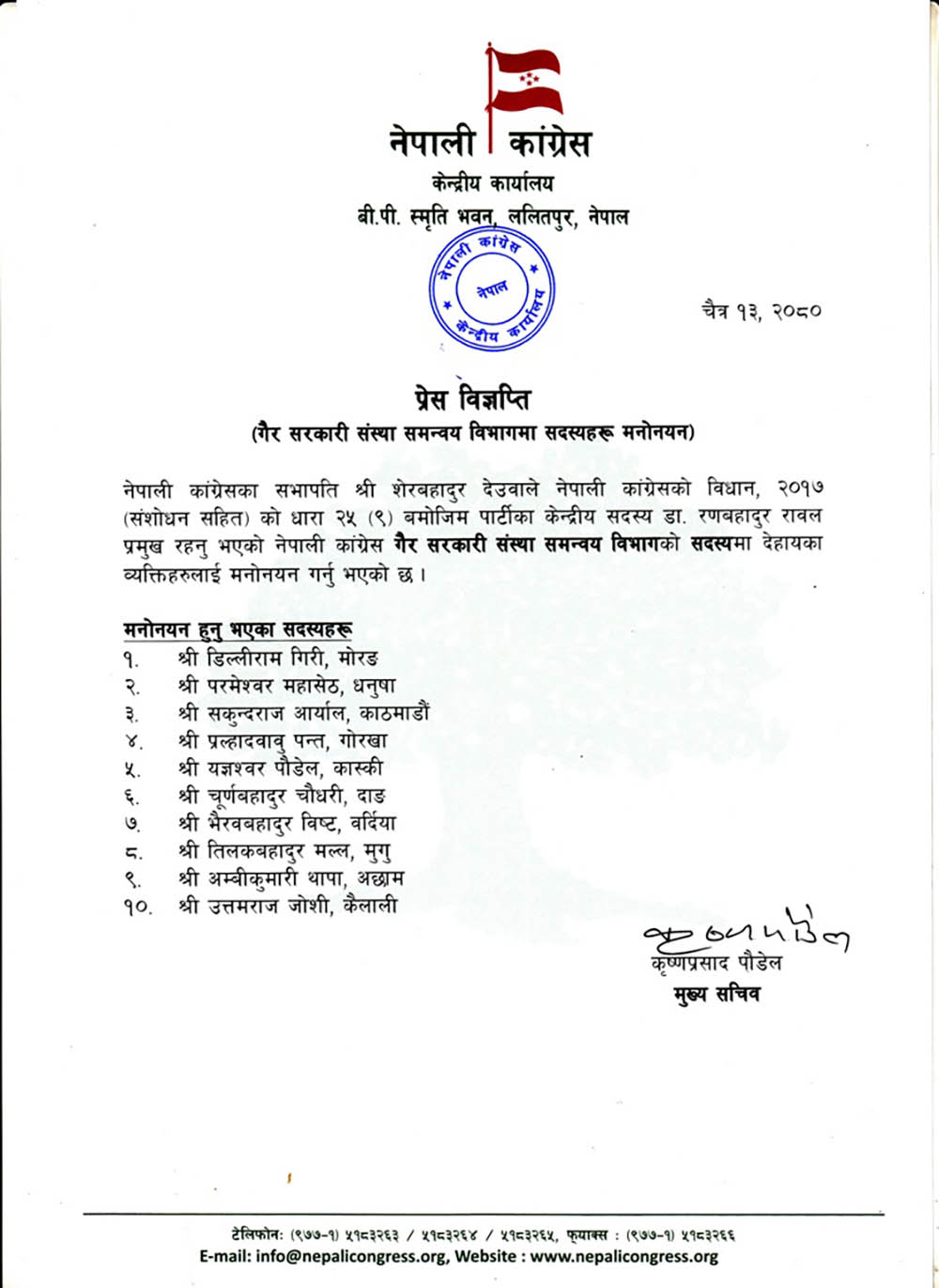 काठमाडौँ । नेपाल कांग्रेसका सभापति शेरबहादुर देउवाले पार्टीको गैर सरकारी संस्था समन्वय विभागमा १० सदस्य मनोनित गरेका छन् ।
