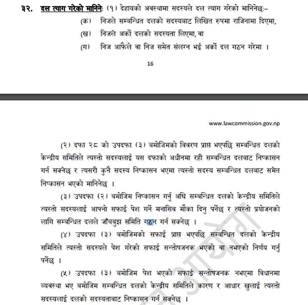 राजनीतिक दल सम्बन्धी ऐनको दफा ३२ मा कुनै पनि सांसदले दलको सदस्यबाट राजीनामा दिएमा, अर्को दलको सदस्यता लिएमा वा आफैं संलग्न भई अर्को दल गठन गरेमा दल त्याग गरेको मानिने ब्यवस्था गरेको छ । यी कारण भएमा सांसदलाई दलले निष्कासन गर्न सक्ने छ । यसरी निष्कासन गर्नुअघि सांसदलाई सफाइको मौका दिनुपर्ने उल्लेख छ । जाँचबुझका लागि समिति गठन गर्नुपर्ने र सफाइ सन्तोषजनक नभएमा केन्द्रीय समितिको निर्णय गरेर विधानको व्यवस्था बमोजिम आधार र कारण खुलाई कारबाही गर्नुपर्ने व्यवस्था छ ।