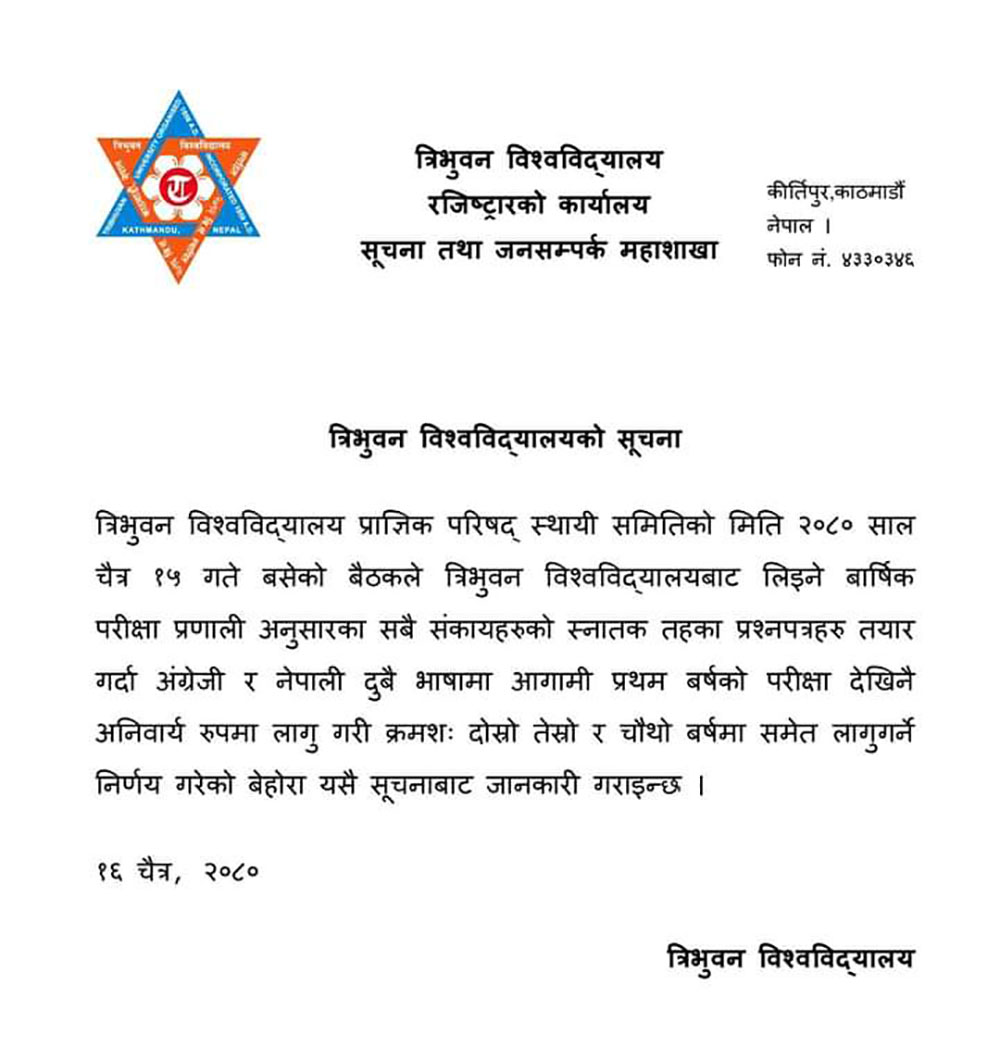 त्रिभुवन विश्वविद्यालय प्राज्ञिक परिषद स्थायी समितिको बैठकले बार्षिक परीक्षा प्रणाली अनुसारका सबै संकायको स्नातक तहका प्रश्न पत्रहरु अंग्रेजी र नेपाली भाषामा तयार गर्ने निर्णय गरेको हो ।