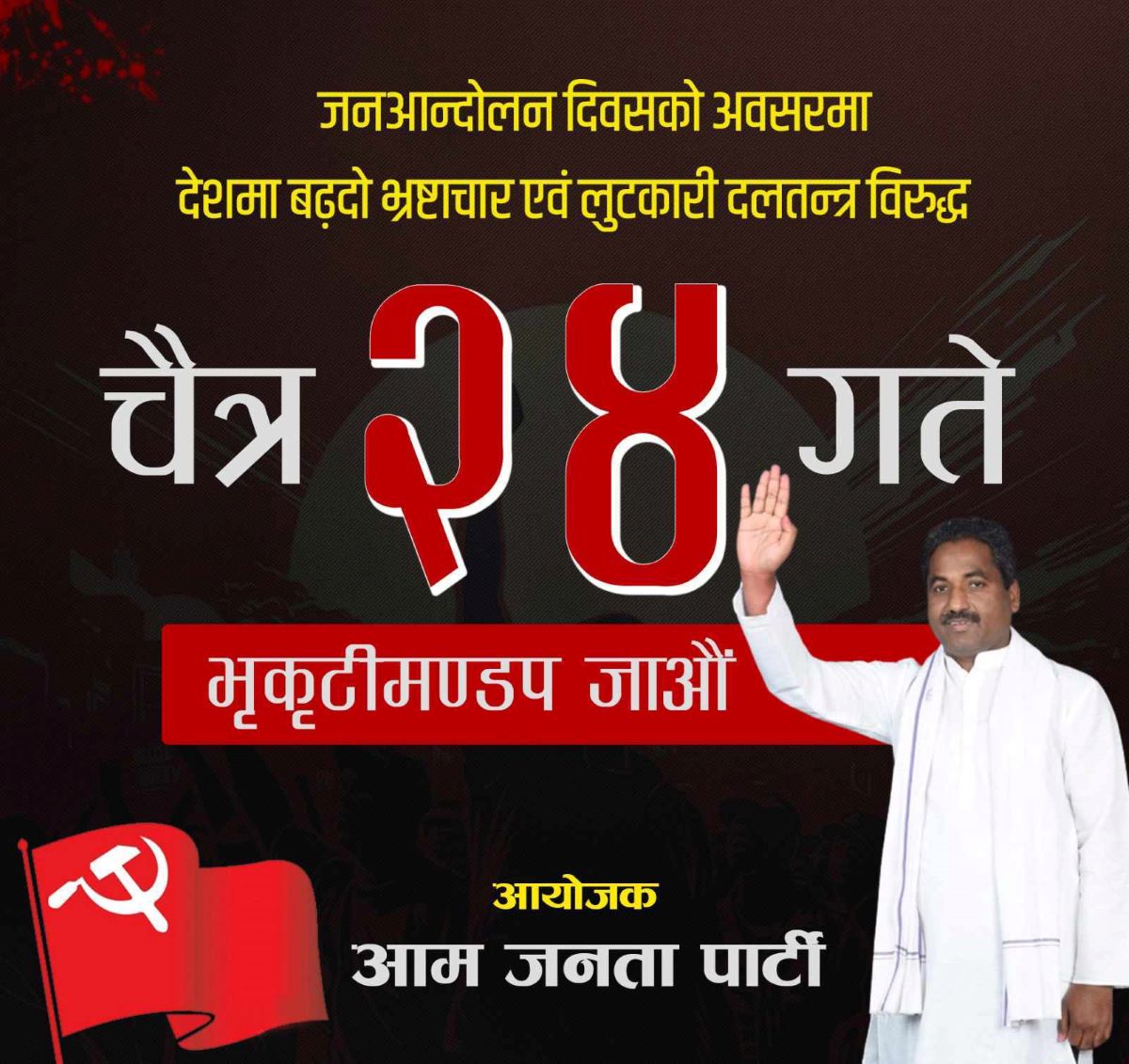 काठमाडौं । आम जनता पार्टी (आजपा) ले पनि दलतन्त्र र भ्रष्टाचारको विरुद्धमा आज शनिबार काठमाडौंमा जनप्रदर्शन गर्दैछ ।