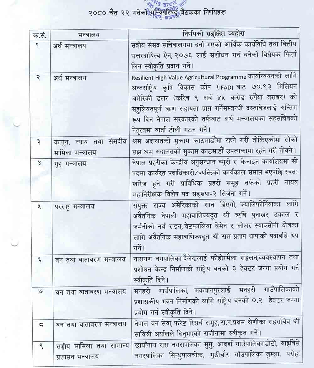 काठमाडौँ । चैत्र २२ गते बसेको मन्त्रिपरिषद्को बैठकका निर्णयहरु सार्बजनिक गरिएको छ ।