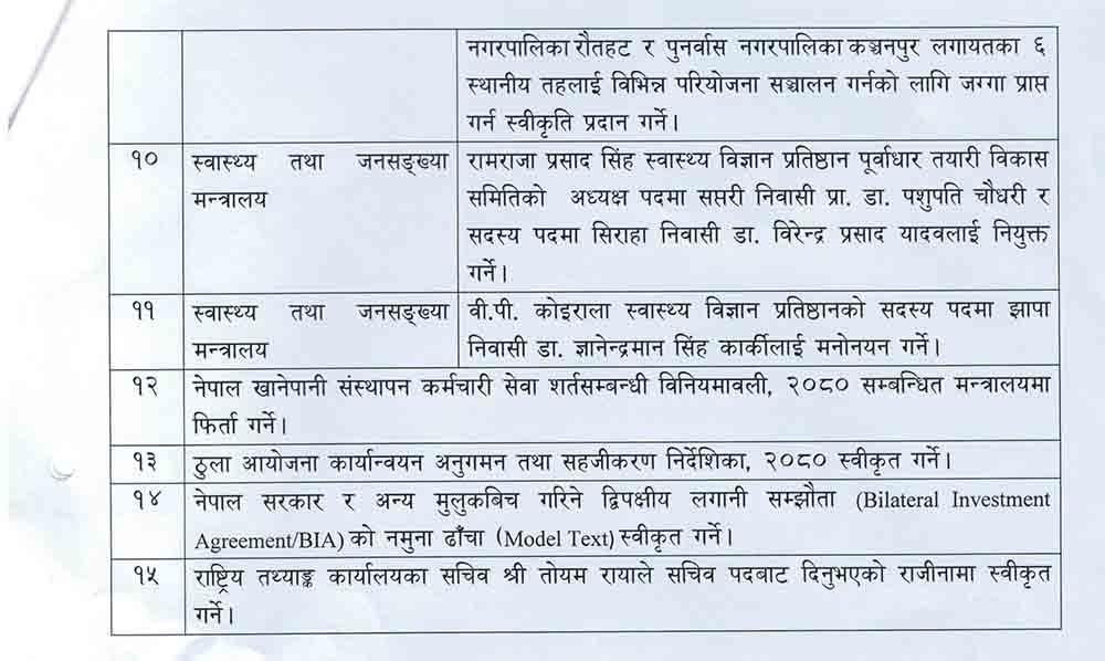 आइतबार मन्त्रिपरिषदले गरेका १५ निर्णय सार्बजनिक गरिएको हो ।