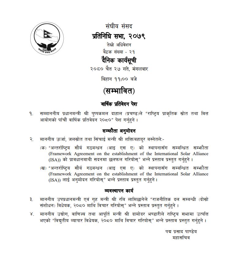 संघीय संसद सचिवालयका अनुसार उर्जा, जलस्रोत तथा सिंचाइ मन्त्री शक्तिबहादुर बस्नेतले ‘अन्तराष्ट्रिय सौर्य गठबन्धन (आईएसए)को स्थापनासँग सबन्धित सम्झौता’ को प्रावधान माथी सदनमा छलफल गरियोस र अनुमोदन गरियोस’ भन्ने प्रस्ताव प्रस्तुत गर्नेछन् ।