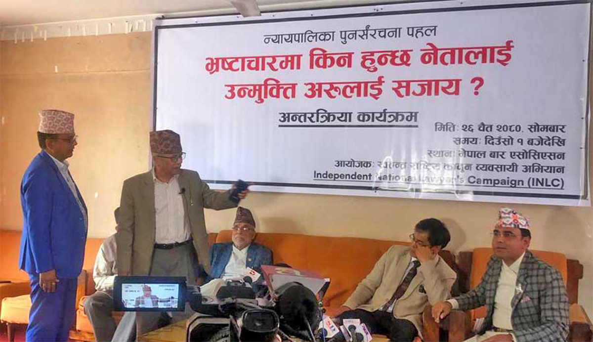 काठमाडौँ । कानुन व्यवसायीहरूले नीतिगत भ्रष्टाचारलाई उन्मुक्ति दिनु नहुने बताएका छन् । स्वतन्त्र राष्ट्रिय कानुन व्यवसायी अभियानले सोमबार नेपाल वार एसोसिएसनको हलमा आयोजना गरेको ‘न्यायपालिका पुनर्संरचना पहल : भ्रष्टाचारमा किन हुन्छ नेतालाई उन्मुक्ति अरूलाई सजाय’ विषयक अन्तरक्रिया कार्यक्रममा सो कुरा बताएका हुन ।