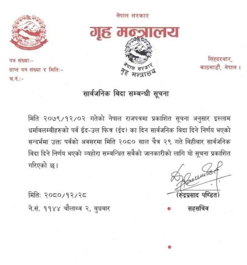 काठमाडौँ । चैत २९ गते ईद उल फित्र (ईद) पर्वको अवसरमा सरकारले सार्वजनिक बिदा दिएको छ । गृह मन्त्रालयले बुधबार सूचना जारी गर्दै भोलि (बिहीबार) इस्लामा धर्माबलम्बीहरुले मनाउने ईदको अवसरमा सार्वजनिक बिदा दिने निर्णय भएको जनाएको हो ।