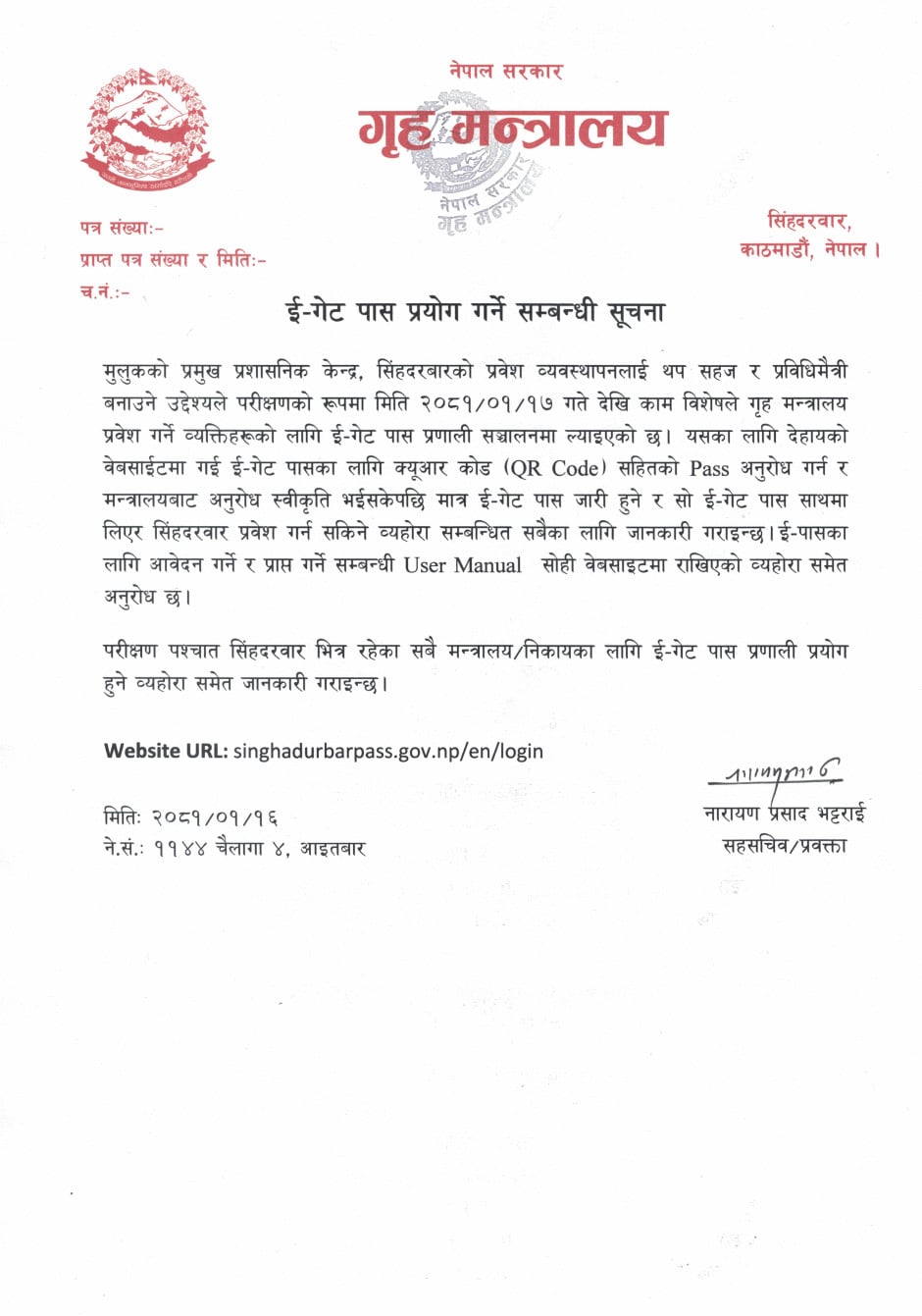 काठमाडौं । सर्वसाधरणहरूका लागि सिंहदरबार प्रवेश गर्न सोमबारदेखि नयाँ प्रणाली सुरु गरिने भएको छ। गृह मन्त्रालयले ई गेट पासको अवधारणा कार्यान्वायनमा ल्याइएको हो।