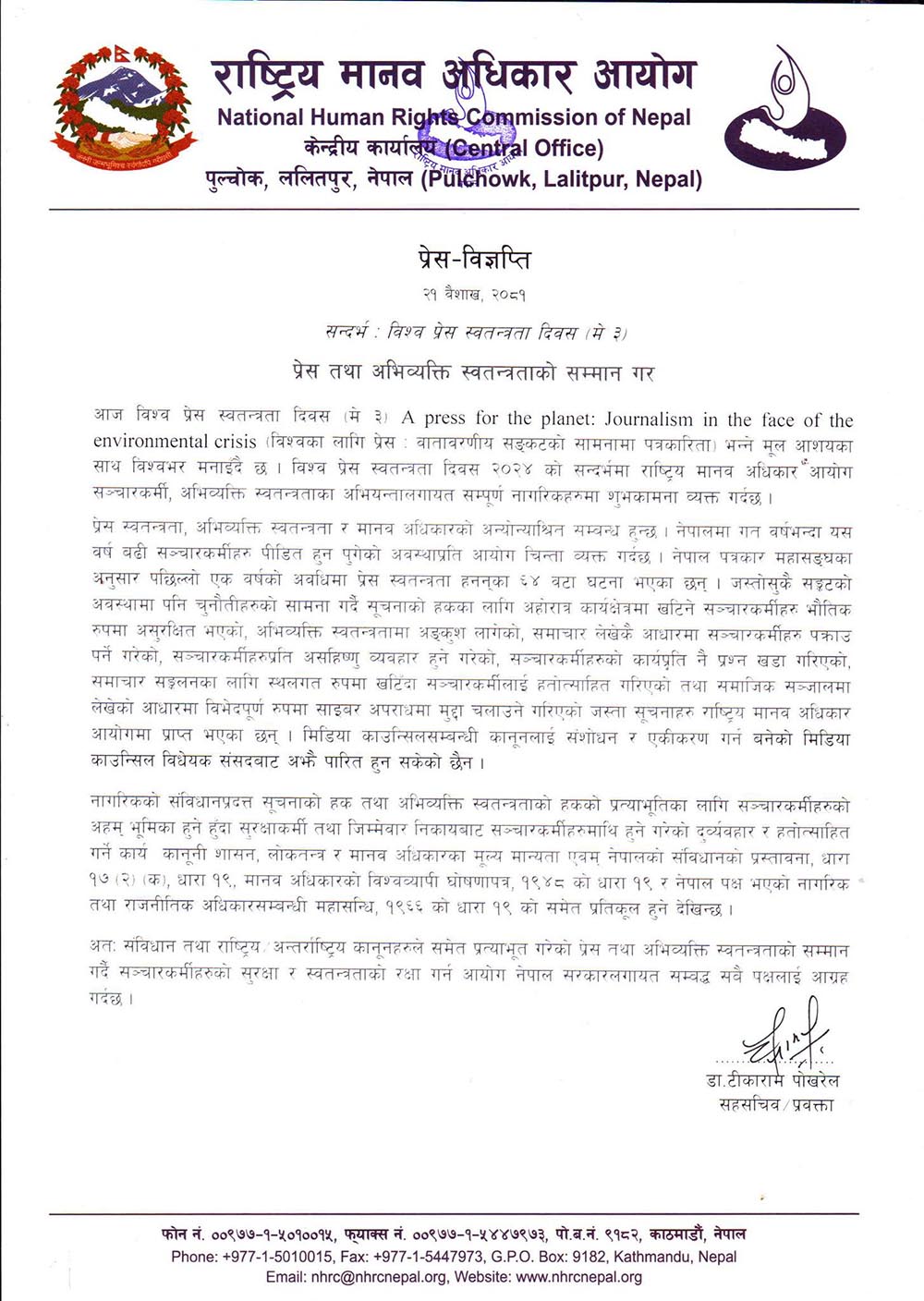 आयोगका प्रवक्ता डा. टीकाराम पोखरेलले विश्व प्रेस स्वतन्त्रता दिवसका अवसरमा विज्ञप्ति जारी गर्दै सुरक्षाकर्मी तथा जिम्मेवार निकायबाट हुने दुर्व्यवहार र हतोत्साहित गर्ने कार्य कानुनी शासन, लोकतन्त्र र मानव अधिकारका मूल्य मान्यताविपरीत रहेको उल्लेख छ ।