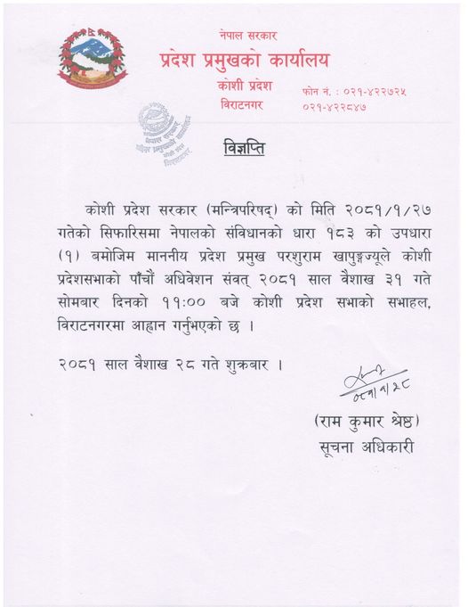 विराटनगर । कोशी प्रदेशका प्रदेश प्रमुख पर्शुराम खापुङले प्रदेशसभाको पाँचौं तथा बर्खे अधिवेशन आह्वान गरेका छन् ।