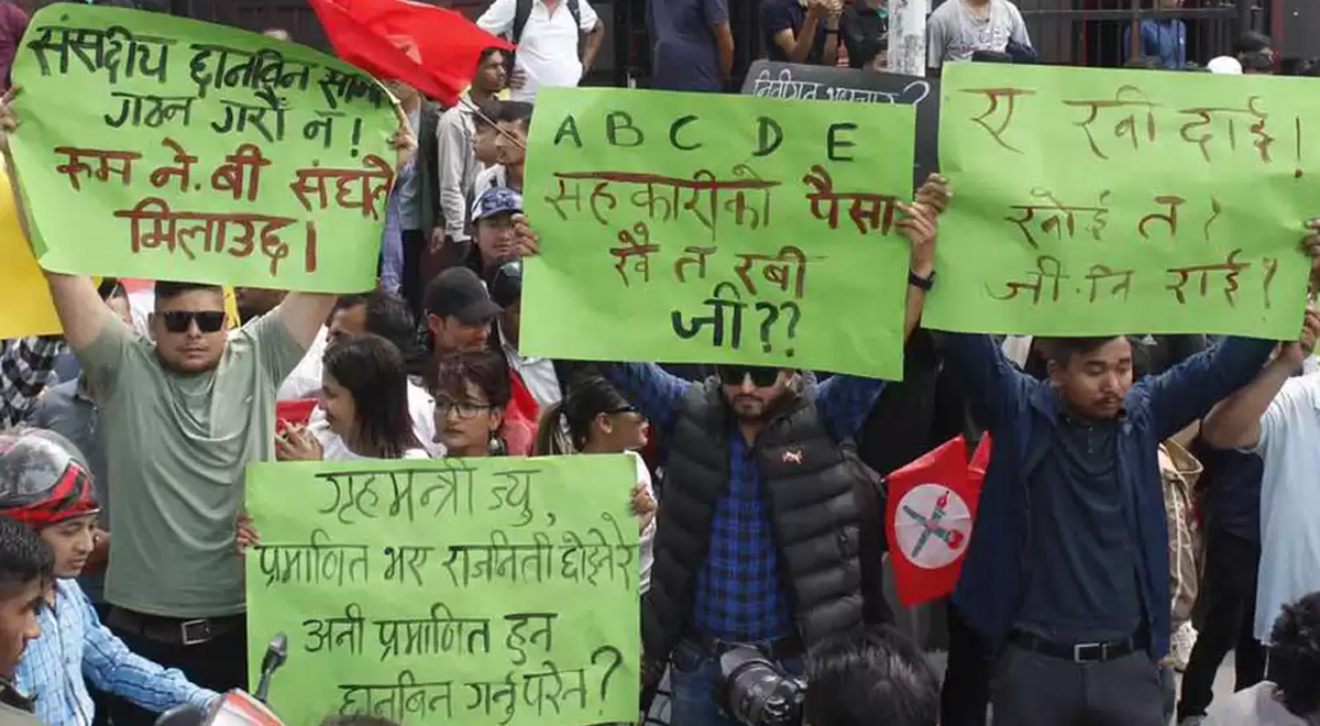 संघले आइतबार नयाँ बानेश्वरमा गृहमन्त्री लामिछानेको राजीनामा माग गर्दै प्रदर्शन गरेको हो । सहकारी ठगी प्रकरणमा मुछिएका लामिछानेले राजीनामा दर्नुपर्ने भन्दै उनीहरुले प्रदर्शन गरेका हुन् ।
