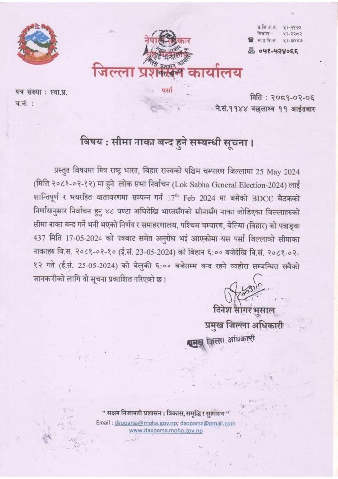 पश्चिम चम्पारण, बेतिया (बिहार) को पत्रबाट चुनावको लागि सिमानाका बन्द गर्न अनुरोध भई आए बमोजिम सिमानाका बन्द गरिने पर्साका प्रमुख जिल्ला अधिकारी दिनेश सागर भुसालले जानकारी दिए ।
