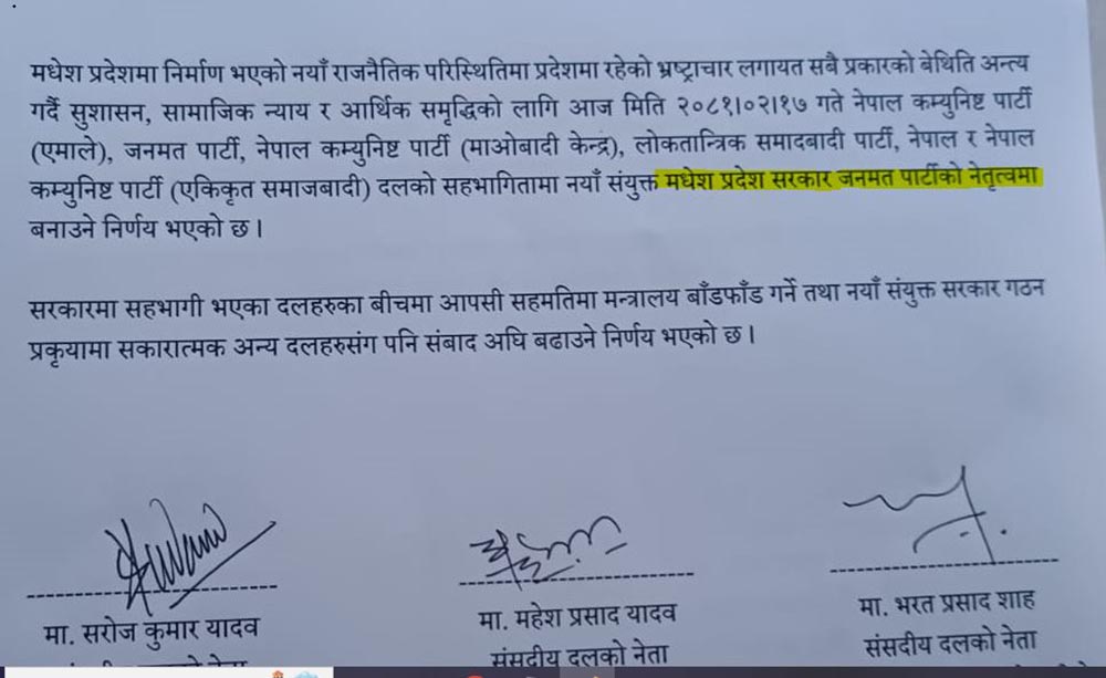 जनमतको नेतृत्वमा सरकार बनाउने ५ दलबिच सहमति भएको भनिएपनि विज्ञप्तिमा भने ३ दलको मात्रै हस्ताक्षर रहेको छ ।