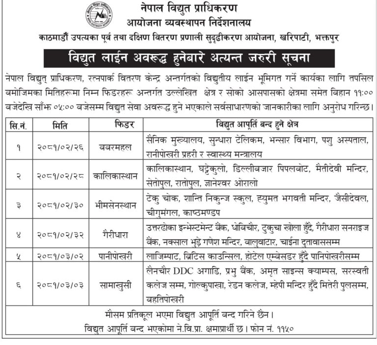 यस्तै, प्राधिकरणले जेठ २८ गते कालिकास्थान फिडर, जेठ ३० गेत भीमसेनस्थान, ३२ गते गैरीधारा, असार २ गते पानीपोखरी र असार ३ गते सामाखुसी फिडर अन्तर्गतका क्षेत्रमा बिहान ११ देखि अपराह्न ५ बजेसम्म सेवा अवरुद्ध हुने जनाएको छ ।