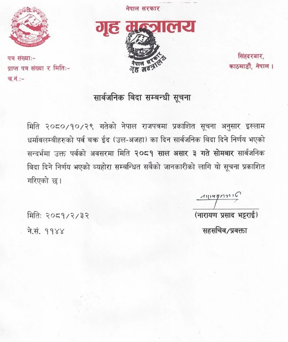 गृह मन्त्रालयले शुक्रबार सूचना जारी गर्दै गते मन्त्रिपरिषद् बैठकको निर्णय अनुसार २०८१ साल असार ३ इस्लाम धर्माबलम्वीहरुको पर्व बक्र ईद (उल–अजाह) दिन सार्वजनिक बिदा दिने निर्णय भएको जनाएको हो ।