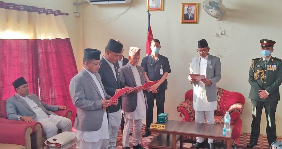 उनीहरूले पनि सपथ पद तथा गोपनीयताको सपथ लिएका छन् । कांग्रेसका मेघराज खड्काले सामाजिक विकास मन्त्री, बहादुरसिंह थापाले आर्थिक मामिला मन्त्री, एमालेका सुरेन्द्रबहादुर पाल भौतिक पूर्वाधार विकास मन्त्री, हिरा सार्की आन्तरिक मामिला तथा काननु मन्त्री र बिरबहादुर थापा भूमि व्यवस्था कृषि तथा सहकारी मन्त्री र नागरिक उन्मुक्ति पार्टीका लक्ष्मणकिशोर चौधरीले उद्योग पर्यटन वन तथा वातावरण मन्त्रीको सपथ लिएका छन् ।