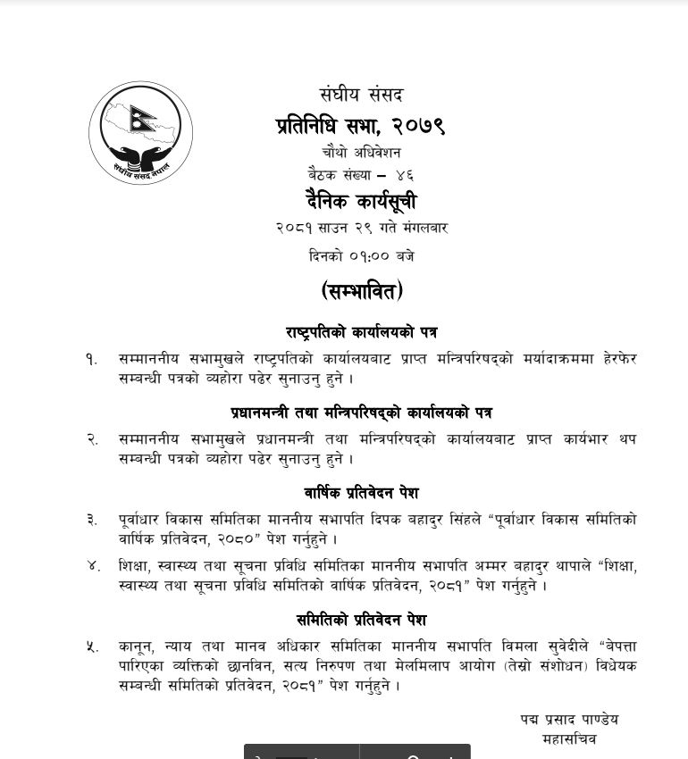 आजको बैठकमा सभामुख देवराज घिमिरेले राष्ट्रपति कार्यालयवाट प्राप्त मन्त्रिपरिषदको मर्यादाक्रम हेरफेर सबन्धी पत्र र प्रधानमन्त्री तथा मन्त्रिपरिषदको कार्यालयवाट प्राप्त कार्यभार थप सबन्धी पत्रको ब्योहोरा पढेर सुनाउने छन ।