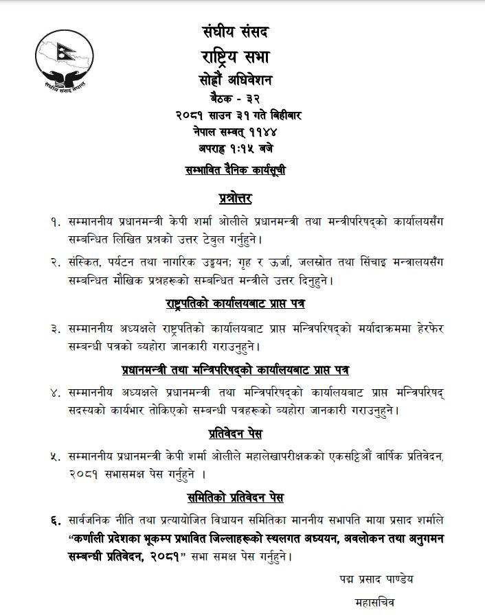 सार्वजनिक नीति तथा प्रत्यायोजित विधायन समितिका सभापति माया प्रसाद शर्माले ‘कर्णाली प्रदेशका भूकम्प प्रभावित जिल्लाहरूको स्थलगत अध्ययन, अवलोकन तथा अनुगमन सम्बन्धी प्रतिवेदन, २०८१’ सभा समक्ष पेस गर्ने सम्भावित कार्यसूची रहेको छ ।