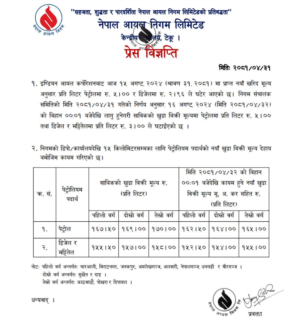 निगमले भारतबाट आएको नयाँ मुल्य सूचीमा पेट्रोल प्रतिलिटर ५ र डिजल तथा मट्टीतेल प्रतिलिटर २ रुपैयाँ ९६ पैसाले घटेर आएको जनाएको छ ।