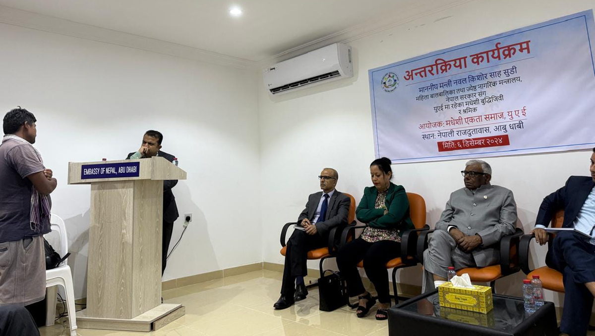 काठमाडौं । यूएईको राजधानी अबुधाबीमा रहेको नेपाली दूताबासमा मधेशी एकता समाज यूएईले आयोजना गरेको अन्तरक्रिया कार्यक्रममा महिला बालबालिका तथा जेष्ठनागरिक मन्त्री नवलकिशोर शाहले यूएईका मधेशी बु्धिजीवी र श्रमिकहरुसंग अन्तरक्रिया गरेका छन् ।