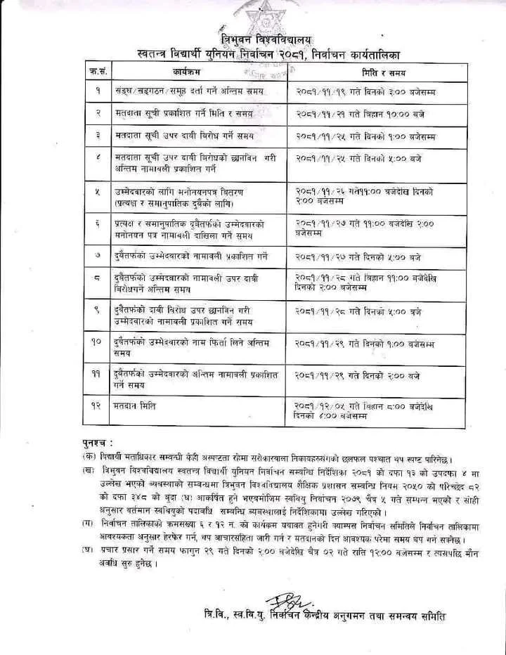 त्रिभुवन विश्वविद्यालय, स्ववियु निर्वाचन केन्द्रीय अनुगमन तथा समन्वय समितिले शुक्रबार आगामी चैत ५ गते चुनावकाे मिति तोक्दै त्यसका लागि संघसंगठन दर्ता गर्न फागुन १९ गतेसम्मको समय दिएको हो ।