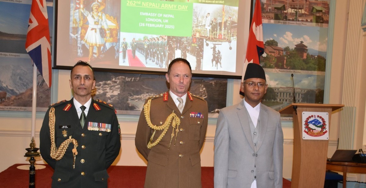 कार्यक्रमलाई सम्बोधन गर्दै बेलायतका लागि नेपाली राजदूत डा चन्द्रकुमार घिमिरेले नेपाली सेनाको गौरवशाली इतिहास र दिगो विरासतको स्मरण गरे। उनले नेपालको सार्वभौमसत्ता, भौगोलिक अखण्डता र राष्ट्रिय हितको संरक्षण र प्रवर्द्धनमा नेपाली सेनाको योगदान उल्लेखनीय रहेको बताए।