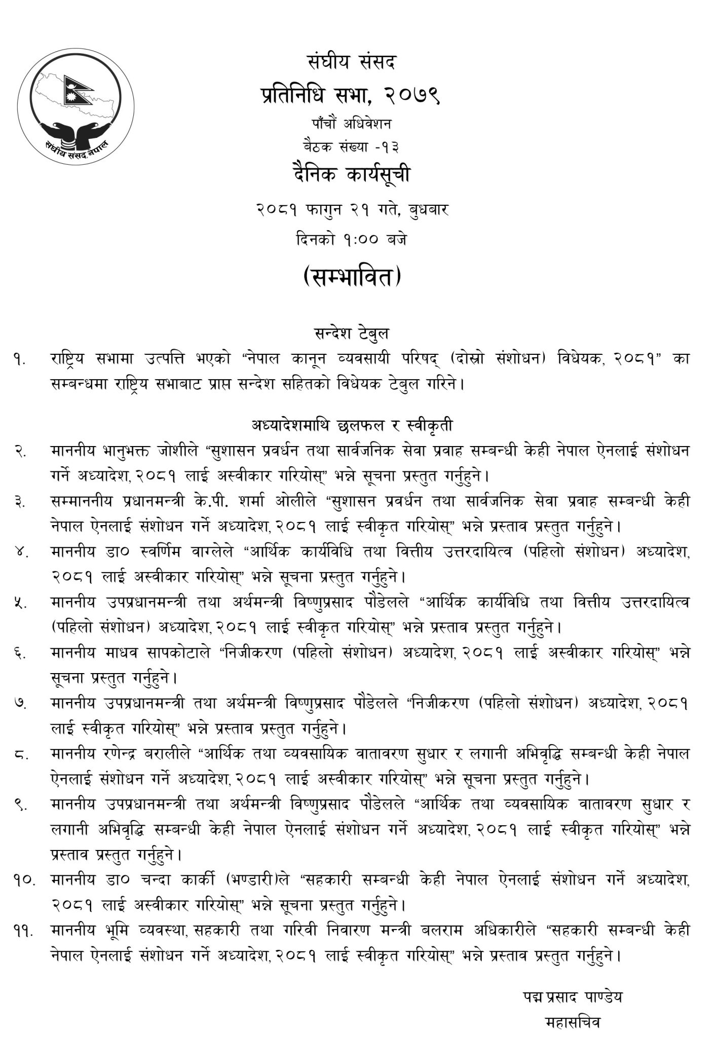मंगलबार बसेको प्रतिनिधि सभाको कार्यव्यवस्था परामर्श समितिको बैठकले अध्यादेश स्वीकृतिका लागि निर्णयार्थ पेस गर्ने कार्यसूची तय गरेको हो । यसअघि गत माघ २४ गते अध्यादेश कार्यसूचीमा चढेर पनि स्थगित भएको थियो । त्यसको झण्डै एक महिनापछि अध्यादेश अगाडि बढाउने सम्बन्धी कार्यक्रम कार्यसूचीमा परेको हो ।