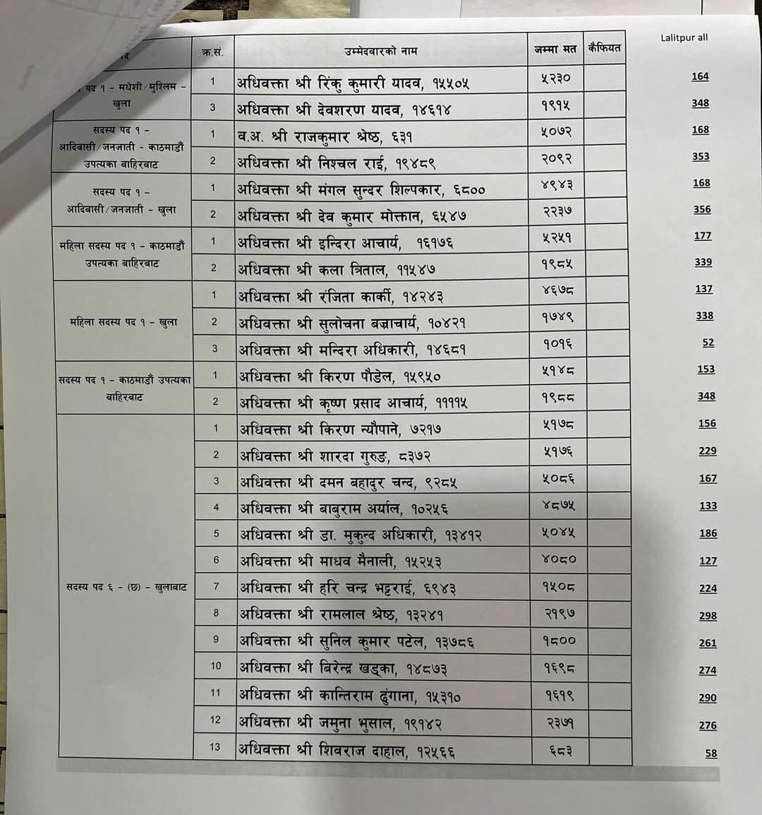 यसैगरी, खुलातर्फ सदस्यमा किरण न्यौपाने पाँचहजार १७८ मत, शारदा गुरुङ पाँचहजार १७६, दमनबहादुर चन्द पाँचहजार ६, मुकुन्द अधिकारी पाँचहजार ४५, बाबुराम अर्याल चारहजार ८७५ र माधव मैनाली चारहजार ८० मतसहित निर्वाचित भए । महिला खुलातर्फ रञ्जिता कार्की चारहजार ६३७ मतसहित निर्वाचित भएकी छन् ।