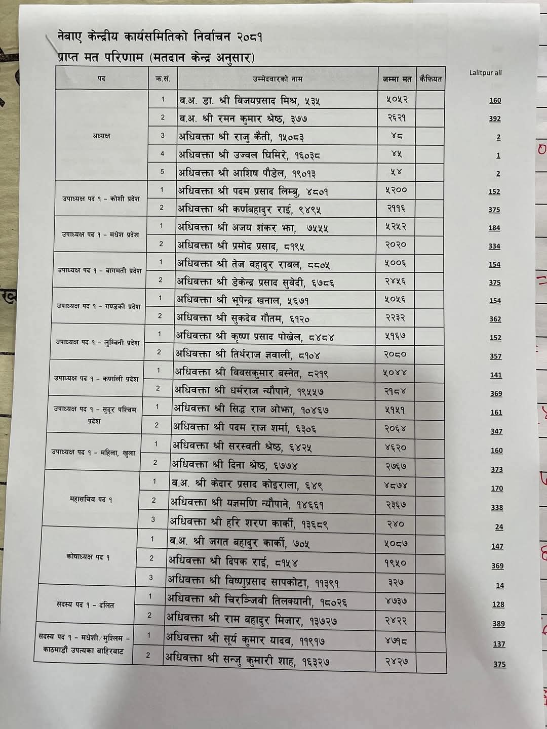 काठमाडौं । नेपाल बार एसोसिएसनको नयाँ नेतृत्वमा कांग्रेस–एमाले प्यानलका विजयप्रसाद मिश्र नेतृत्वको प्यानलै विजयी भएको छ । अध्यक्षमा मिश्र ५०५२ मतसहित विजयी हुँदा उनका निकटतम प्रतिस्पर्धी विपक्षी गठबन्धनबाट भिडेका माओवादीनिकट कानून व्यवसायी रमन श्रेष्ठले २६२१ मत मात्र ल्याए ।