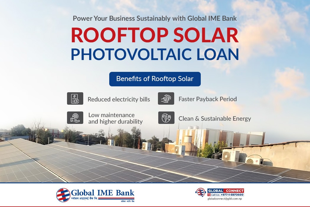 काठमाडौं । ग्लोबल आइएमई बैंक लिमिटेडले पृथ्वी दिवसको अवसरमा औद्योगिक र व्यावसायिक भवनमा सोलार सिस्टम जडानलाई प्रोत्साहन गर्न रुफटप सोलार कर्जा योजना सार्वजनिक गरेको छ ।