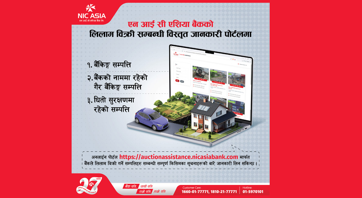 बैंकले सञ्चालनमा ल्याएको उक्त अनलाईन पोर्टलमा नियमित रुपमा बैंकिङ्ग सम्पत्ति, गैर बैंकिङ्ग सम्पत्ति तथा बैंकमा धितो सुरक्षण रहि लिलाम बिक्रीमा रहेको सम्पत्तिहरु र लिलाम बिक्री सम्बन्धी अन्य सूचनाहरू प्रकाशित गरिने हुँदा इच्छुक ग्राहकहरूले अनलाईन पोर्टलको लिंक https://auctionassistance.nicasiabank.com बाटै विस्तृत विवरणहरूको जानकारी लिई लाभ लिन सक्नुहुने बैंकले विश्वास लिइएको जनाएको छ ।