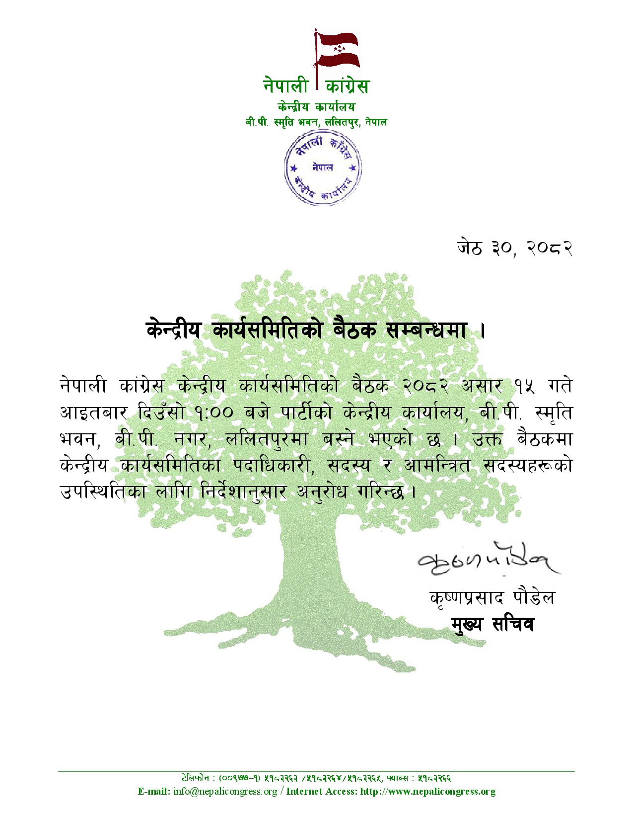 काठमाडौँ । नेपाली कांग्रेसले केन्द्रीय समिति बैठक बोलाएको छ । पार्टी मुख्यसचिव कृष्णप्रसाद पौडेलले असार १५ गते दिउँसो १ बजे आइतबार बस्ने गरी बैठक तय भएको जानकारी दिएका छन् ।