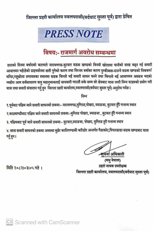जिल्ला प्रहरी कार्यालय, नवलपरासी (बर्दघाट सुस्ता पूर्व) ले बिहीबार सूचना जारी गर्दै यात्रुहरूलाई वैकल्पिक मार्ग प्रयोग गर्न आग्रह गरेको छ।