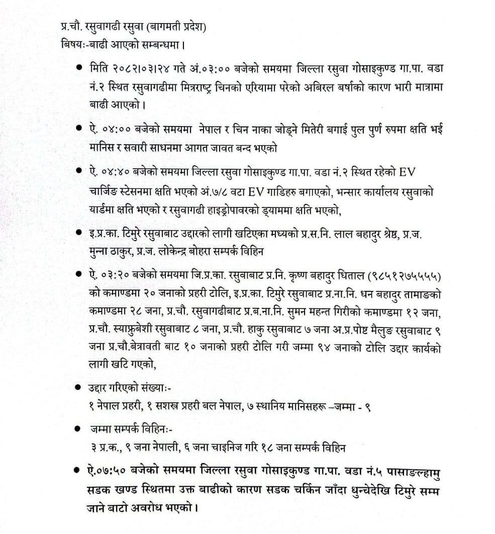 मंगलबार बिहान ३ बजे चीन क्षेत्रमा परेको अविरल वर्षापछि भोटेकोसी नदीमा आएको बाढीले ठूलो क्षति पुर्याएको हो । रसुवा प्रहरीले दिएको जानकारीअनुसार ३ जना सुरक्षाकर्मीसहित १८ जना बेपत्ता छन् ।