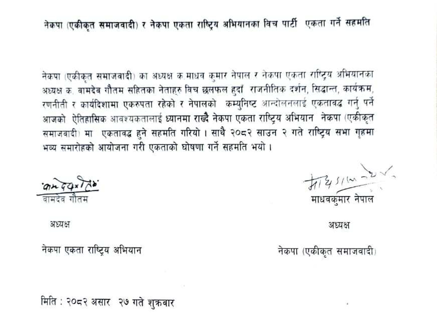 यस विषयमा दुबै पक्षबीच सहमति भइसकेको छ, जसमा नेकपा (एकीकृत समाजवादी) का अध्यक्ष माधवकुमार नेपाल र एकता राष्ट्रिय अभियानका अध्यक्ष बामदेव गौतमले हस्ताक्षर गरेका छन्।