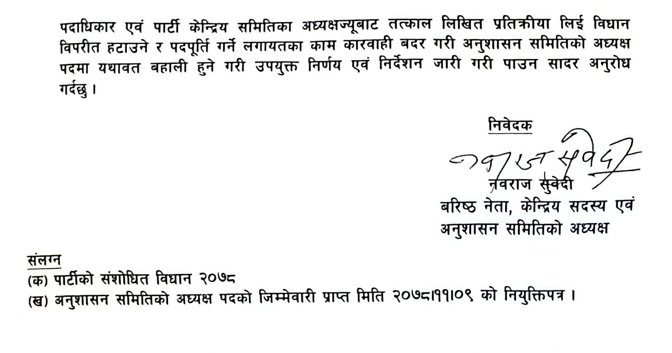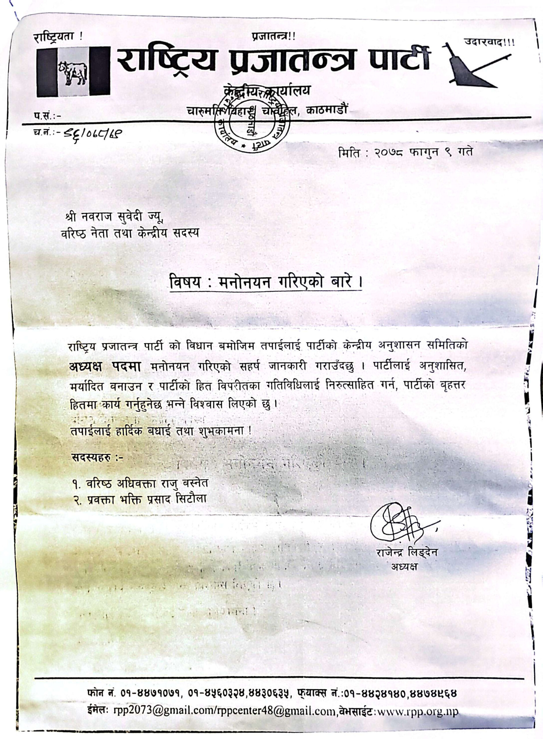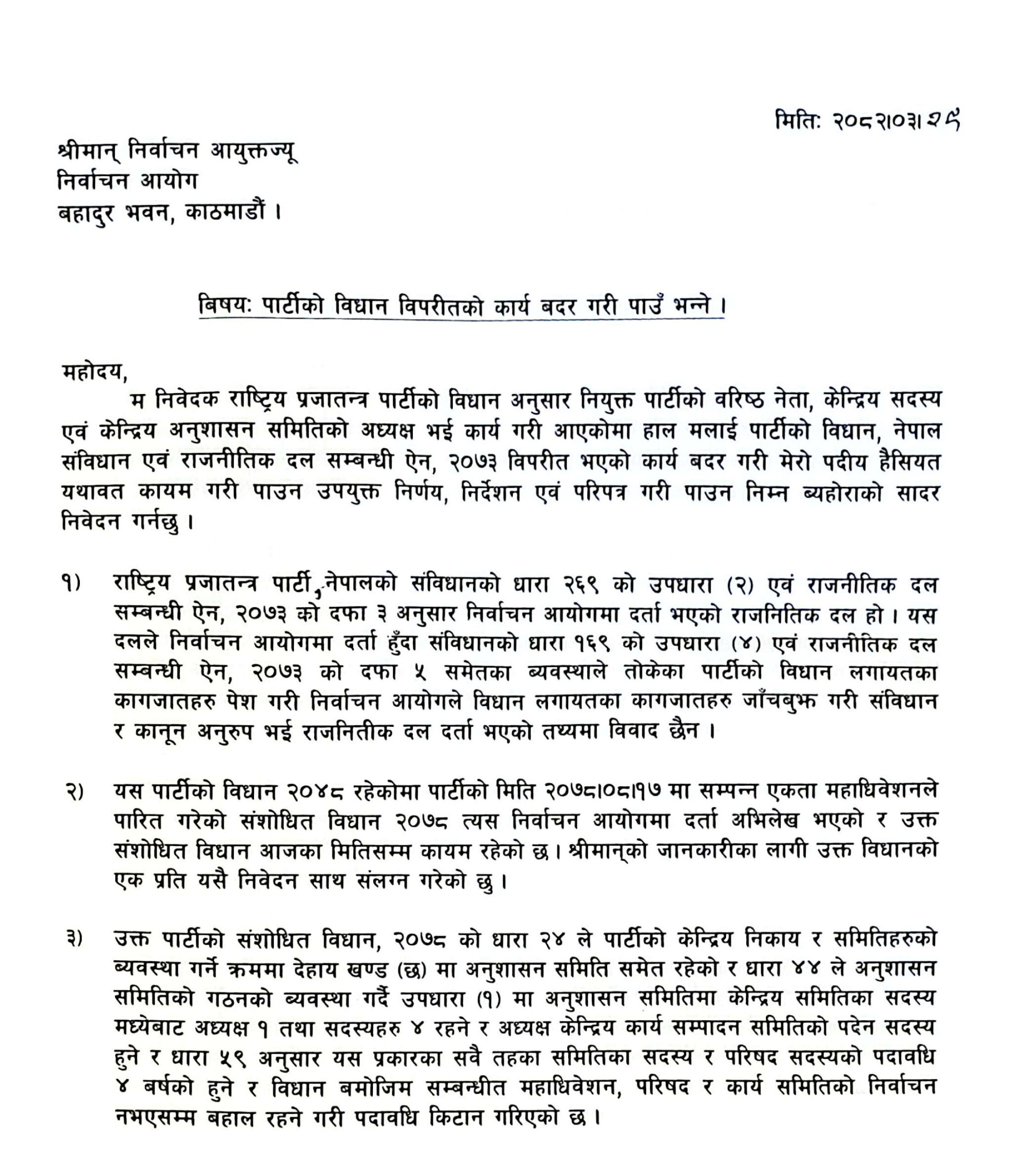 उक्त उजुरी निवेदन दिन सुवेदीसँगै राप्रपाका महामन्त्री धवलशम्शेर राणा, वरिष्ठ नेता डा. प्रकाशचन्द्र लोहनी, प्रवक्ताबाट हटाइएका सगुन सुन्दर लावतीसहितका नेताहरू आयोगमा पुगेका थिए ।