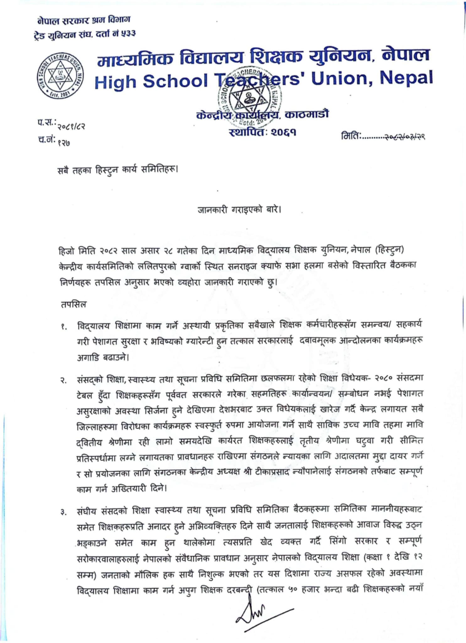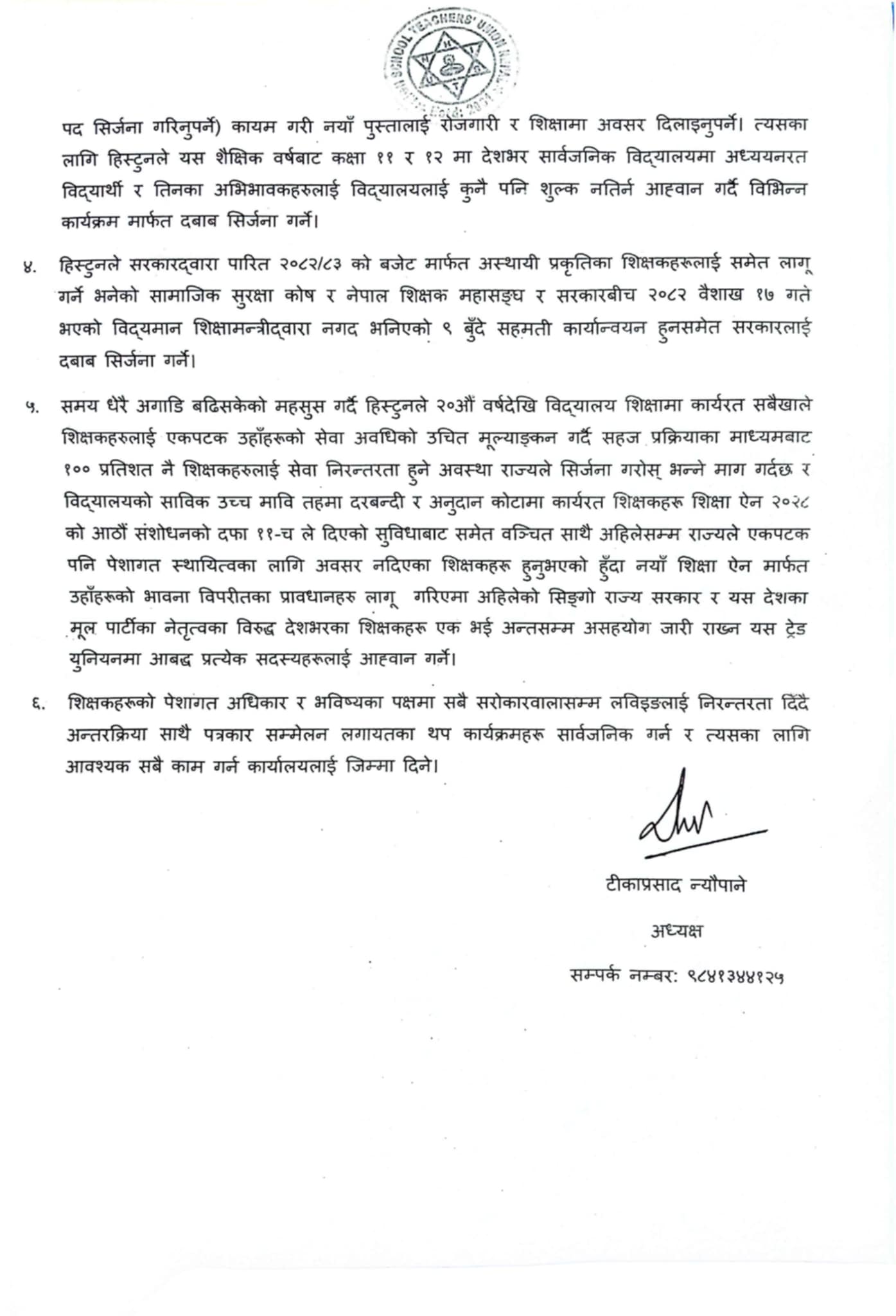 हिस्टुनले सरकारद्वारा पारित २०८२/८३ को बजेट मार्फत अस्थायी प्रकृतिका शिक्षकहरूलाई समेत लागू गर्ने भनेको सामाजिक सुरक्षा कोष र नेपाल शिक्षक महासङ्घ र सरकारबीच २०८२ वैशाख १७ गते भएको विद्यमान शिक्षामन्त्रीद्वारा नगद भनिएको ९ बुँदे सहमती कार्यान्वयन हुनसमेत सरकारलाई दबाब सिर्जना गर्ने, समय धेरै अगाडि बढिसकेको महसुस गर्दै हिस्टुनले २०औँ वर्षदेखि विद्यालय शिक्षामा कार्यरत सबैखाले शिक्षकहरुलाई एकपटक उहाँहरूको सेवा अवधिको उचित मूल्याङ्कन गर्दै सहज प्रक्रियाका माध्यमबाट १०० प्रतिशत नै शिक्षकहरुलाई सेवा निरन्तरता हुने अवस्था राज्यले सिर्जना गरोस् भन्ने माग र विद्यालयको साविक उच्च मावि तहमा दरबन्दी र अनुदान कोटामा कार्यरत शिक्षकहरू शिक्षा ऐन २०२८ को आठौं संशोधनको दफा ११–च ले दिएको सुविधाबाट समेत वञ्चित साथै अहिलेसम्म राज्यले एकपटक पनि पेशागत स्थायित्वका लागि अवसर नदिएका शिक्षकहरू हुनुभएको हुँदा नयाँ शिक्षा ऐन मार्फत उहाँहरूको भावना विपरीतका प्रावधानहरु लागू गरिएमा अहिलेको सिङ्गो राज्य सरकार र यस देशका मूल पार्टीका नेतृत्वका विरुद्ध देशभरका शिक्षकहरू एक भई अन्तसम्म असहयोग जारी राख्न यस ट्रेड युनियनमा आबद्ध प्रत्येक सदस्यहरूलाई आह्वान गर्ने निर्णय छ ।