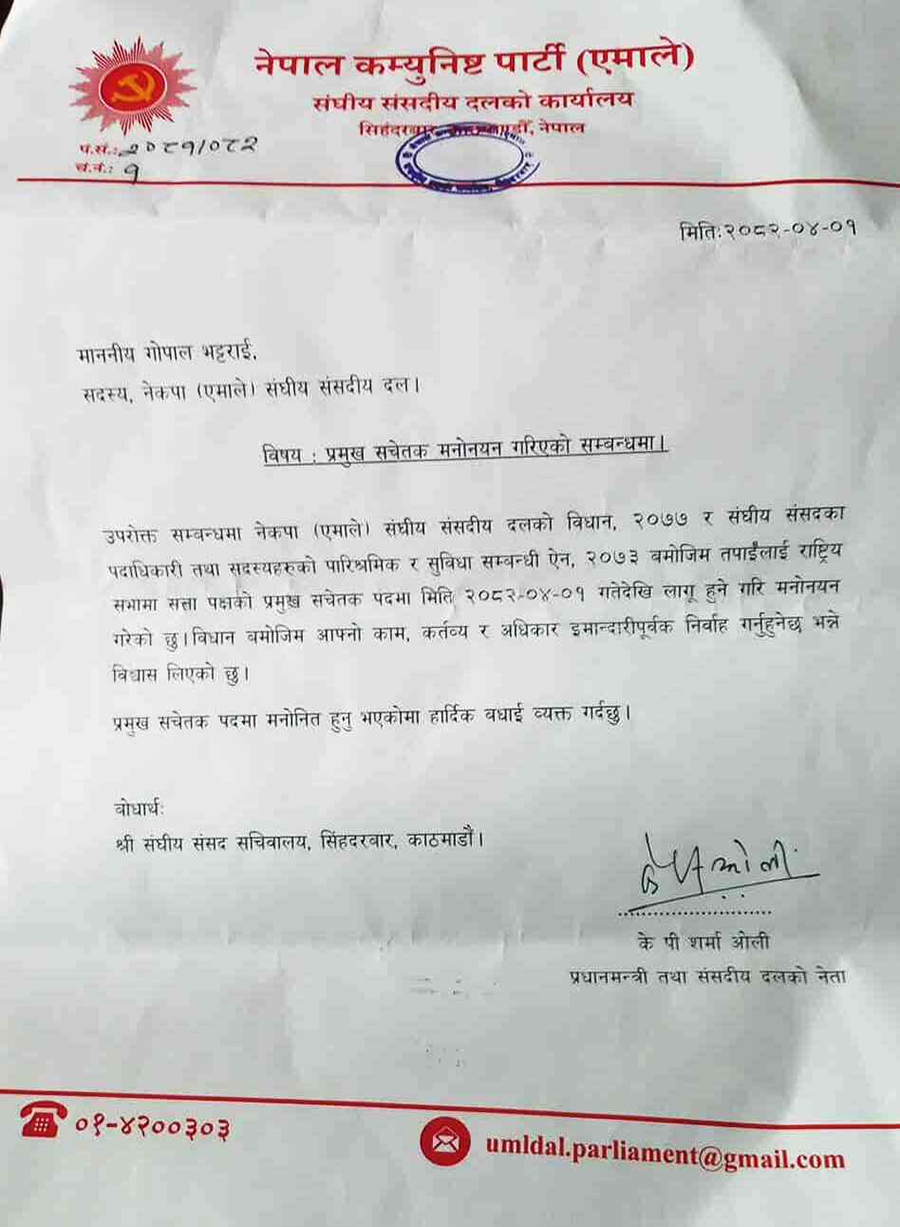 प्रधानमन्त्री तथा एमाले संसदीय दलका नेता केपी शर्मा ओलीले आगामी १ साउनदेखि लागू हुनेगरी भट्टराईलाई यो जिम्मेवारी दिएका हुन्।