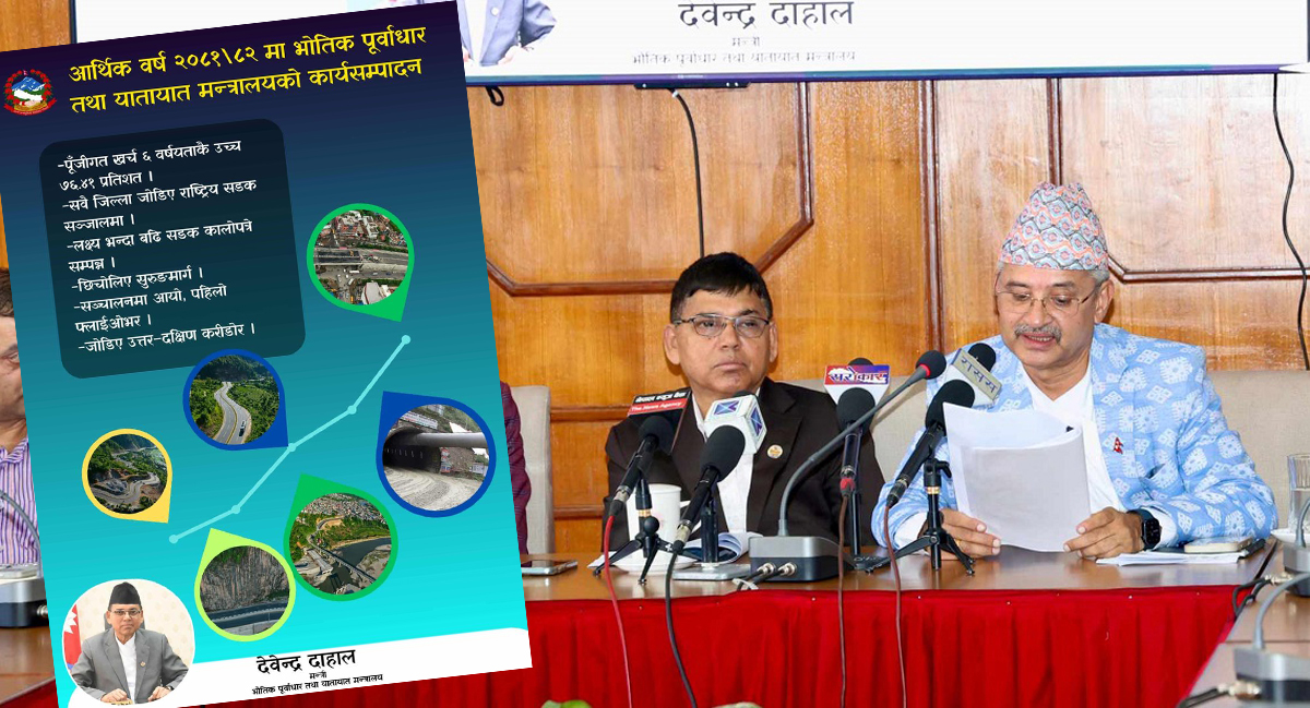 काठमाडौं, साउन २ । भौतिक पूर्वाधार तथा यातायात मन्त्री देवेन्द्र दाहालले सरकारको एक वर्षे कार्यकालमा उल्लेखनीय प्रगति भएको दाबी गरेका छन् । शुक्रबार मन्त्रालयमा आयोजित पत्रकार सम्मेलनमा उनले सडक, पुल, सुरुङमार्ग, कानुनी सुधार, र अन्य पूर्वाधार विकासका कामहरूबारे प्रतिवेदन सार्वजनिक गरे ।