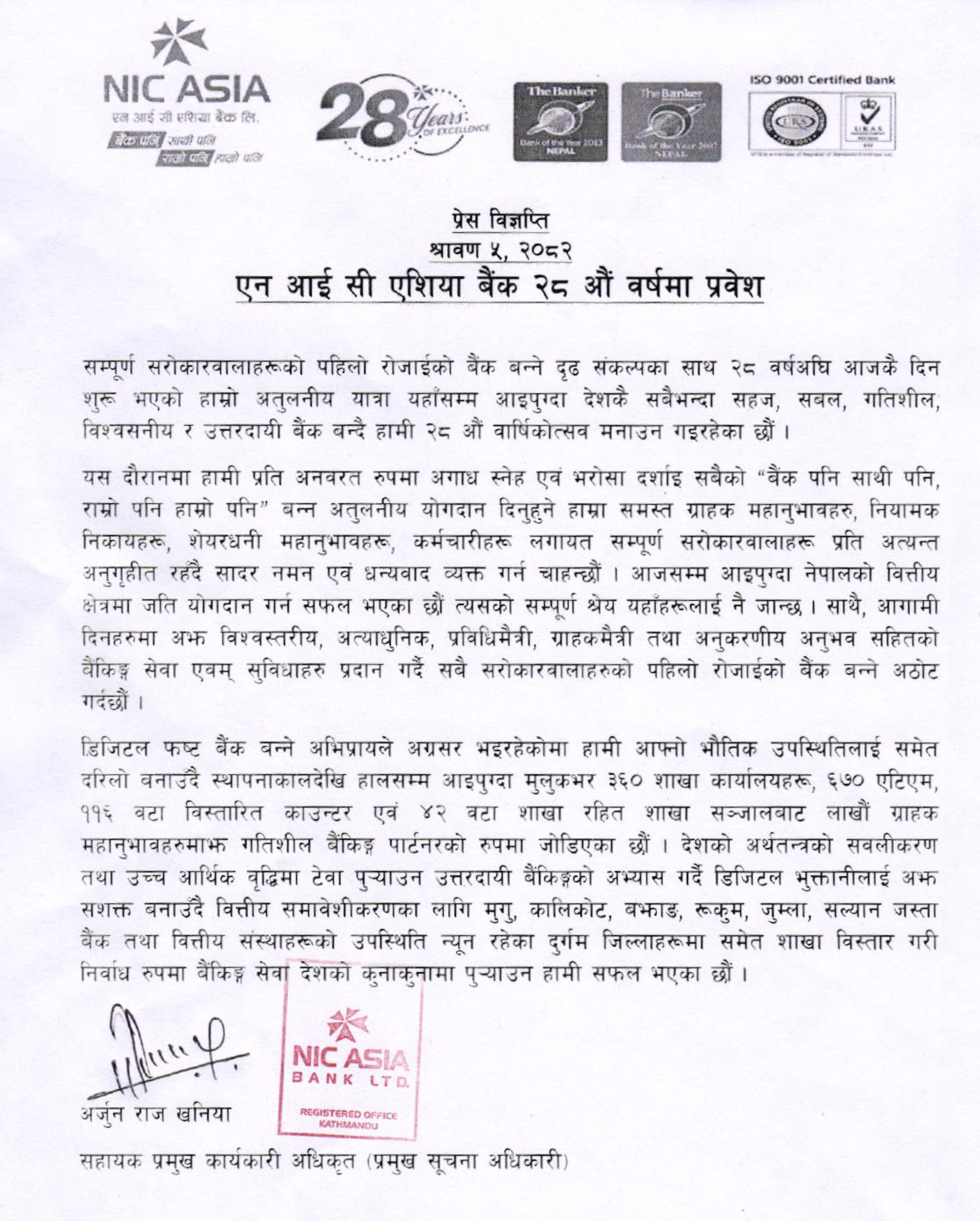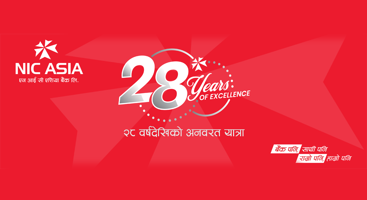 काठमाडौँ । देशभरका लाखौं ग्राहकहरूको विश्वास, सरोकारवालाहरूको समर्थन र कर्मचारीहरूको प्रतिबद्धताका साथ एनआईसी एशिया बैंक आज २८ औं वर्षमा प्रवेश गरेको छ । “बैंक पनि साथी पनि, राम्रो पनि हाम्रो पनि” भन्ने मूल नारालाई आत्मसात गर्दै बैंकले नेपालकै सबैभन्दा सहज, सबल, गतिशील, विश्वसनीय र उत्तरदायी बैंक बन्ने यात्रालाई निरन्तरता दिँदै आएको बैंकद्वारा जारी विज्ञप्तिमा जनाइएको छ ।