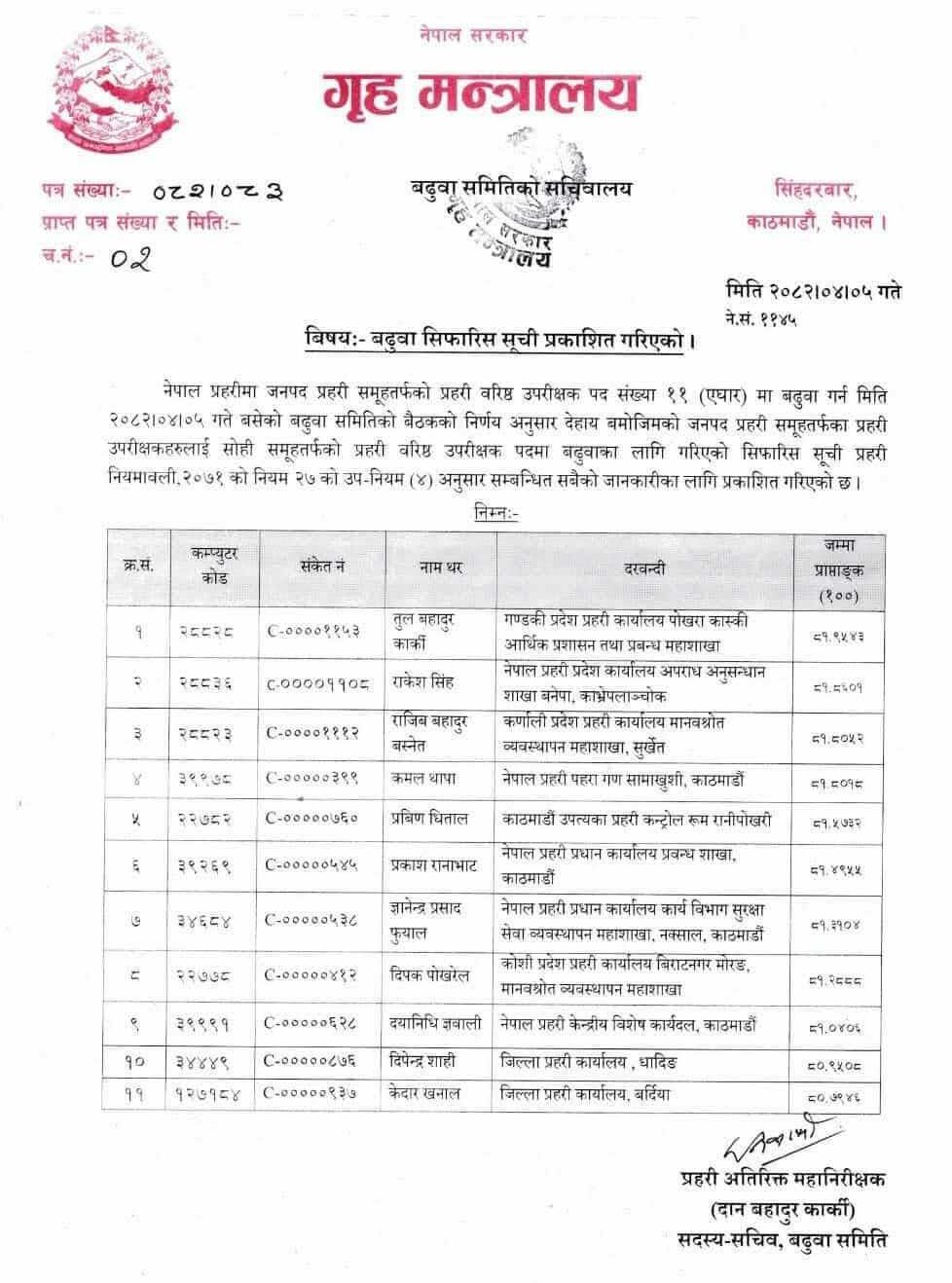 बढुवा सिफारिस सूचीमा परेका अधिकृतहरूमा गण्डकी प्रदेश प्रहरी कार्यालय, पोखराका तुलबहादुर कार्की, कोशी प्रदेश प्रहरी कार्यालय, विराटनगरका रामेश सिंह, र कर्णाली प्रदेश प्रहरी कार्यालय, सुर्खेतका राजिव बहादुर बस्नेत छन्।