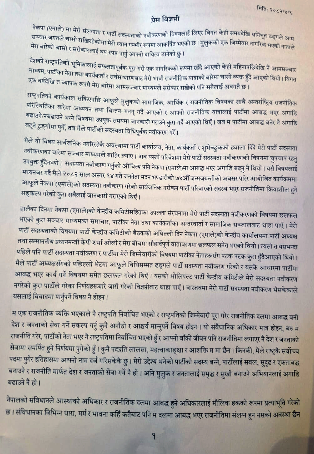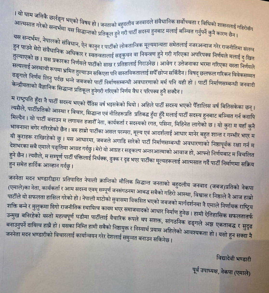 ‘म राजनीतिबाट राष्ट्रपतिको पदमा पुगेकी हुँ । अब फेरि पार्टीमा सक्रिय भई जनसेवामा समर्पित हुने मेरो निर्णय संवैधानिक हकभित्र पर्छ,’ उनले थपिन्, ‘पार्टीको नेता भएर राष्ट्रपतिको पदमा पुगेको म, फेरि आफ्नो राजनीतिक जीवनलाई पार्टीमार्फत अघि बढाउनु स्वाभाविक हो ।’