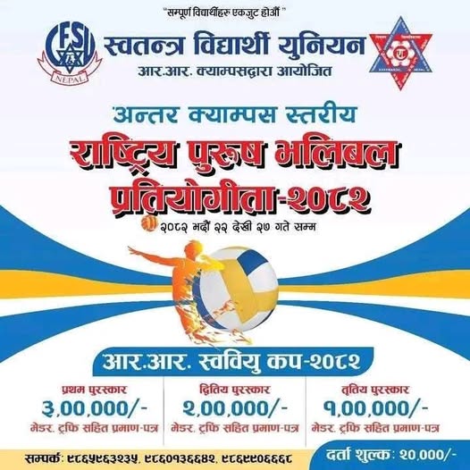 काठमाडौं, साउन ११ । ‘सम्पूर्ण विद्यार्थीहरु एकजुट होऔं’ भन्ने नारा सहित स्वतन्त्र विद्यार्थी युनियन (स्ववियु) रत्न राज्य लक्ष्मी (आरआर) क्याम्पस कमिटिले भलिबल प्रतियोगिता आयोजना गर्ने भएको छ । ‘आरआर स्ववियु कप–२०८२’ अन्तरक्याम्पस स्तरीय राष्ट्रिय पुरुष भलिबल प्रतियोगिता आगामी भदौ २२ गतेदेखि सुरु हुने भएको हो ।