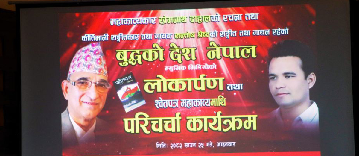 काठमाडौं, साउन २७ । महाकाव्यकार खेमनाथ दाहालको राष्ट्रिय भावनाले ओतप्रोत गीत ‘बुद्धको देश नेपाल’ एक विशेष समारोहका बीच काठमाडौंमा आइतबार भव्य रूपमा विमोचन गरिएको छ। नेपाल संस्कृत विश्वविद्यालयका कुलपति प्रा.डा. कुलप्रसाद कोइरालाको प्रमुख आतिथ्यतामा तथा वरिष्ठ पत्रकार, साहित्यकार एवं हिमालय टाइम्स दैनिकका प्रधान सम्पादक पुरुषोत्तम दाहालको सभापतित्वमा गीतको भिडियो स्विच अन गरेर सार्वजनिक गरिएको हो।